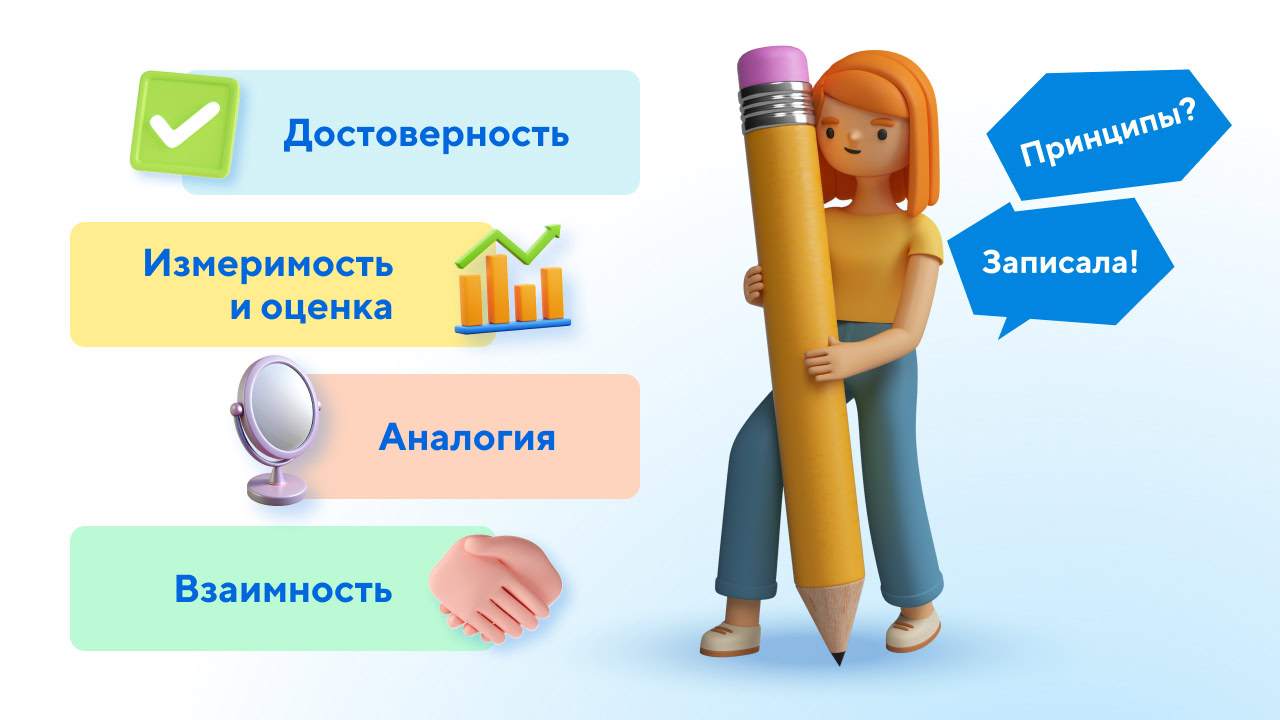 - Достоверность. Все процедуры оценивания должны проводиться на основе конкретных фактических данных, которые можно подтвердить или предъявить в случае спора, а не на основе интуиции или чутья.