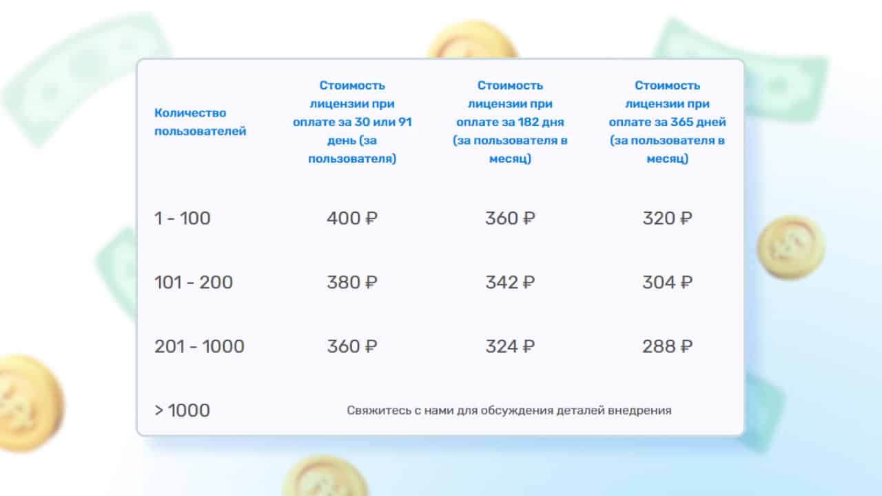 | Стоимость подписок в месяц | От 10,99 до 30,49 USD за пользователя (купить можно только пакетами с определённым количеством рабочих мест) | От 288 до 400 руб. за пользователя (купить можно любое количество лицензий) |