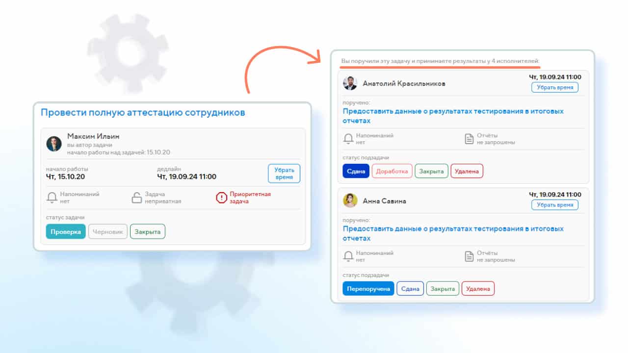☑️ Уровень вложенность подзадач может быть любым. Причём система автоматически выстраивает дерево связей. При делегировании задач сотрудник может изменить описание и другие атрибуты, чтобы задача была максимально конкретизирована для исполнителя.