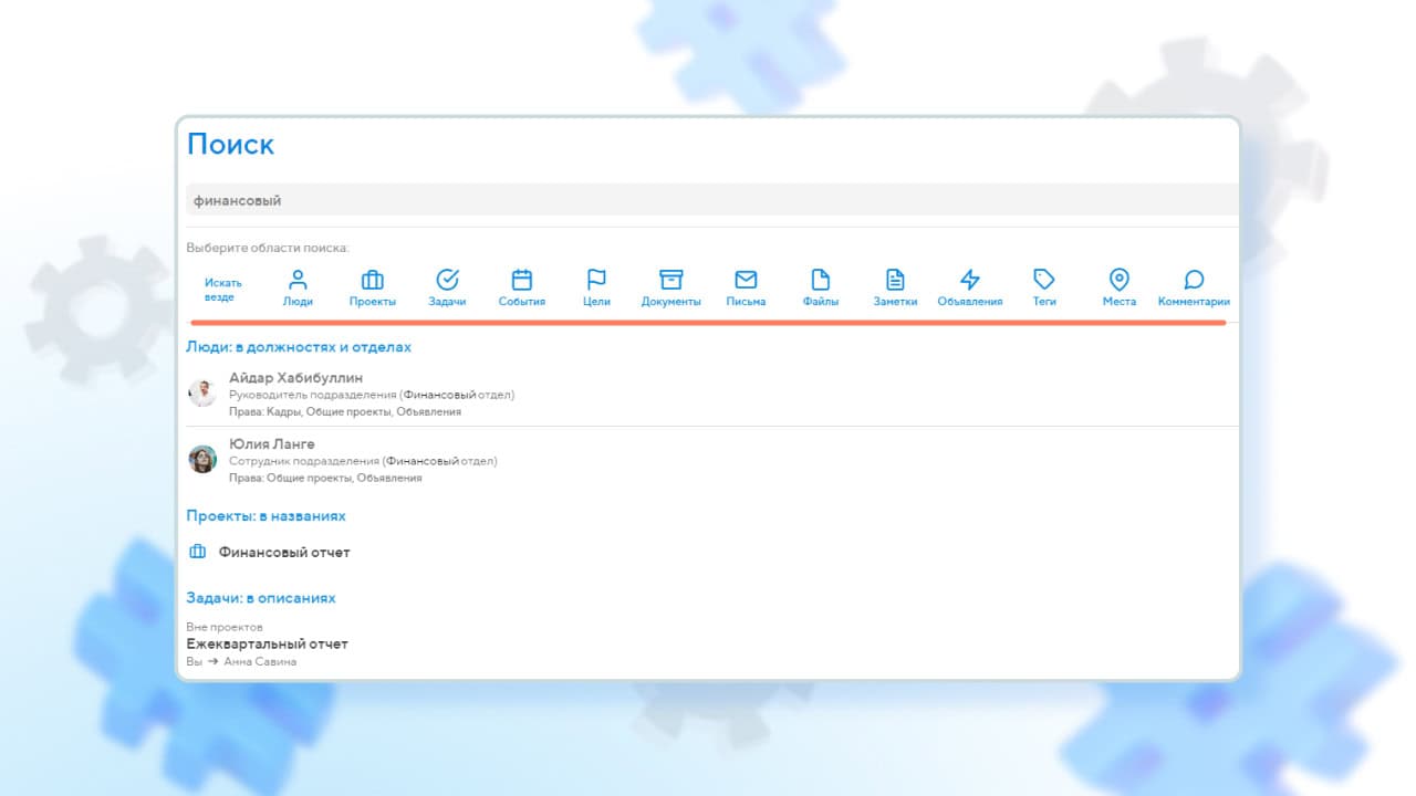 ☑️ Поиск и фильтрация результатов с разбивкой на группы объектов (задачи, проекты, документы и т.п.). Теги, избранное, примечания и другие элементы для дополнительной фильтрации контента.