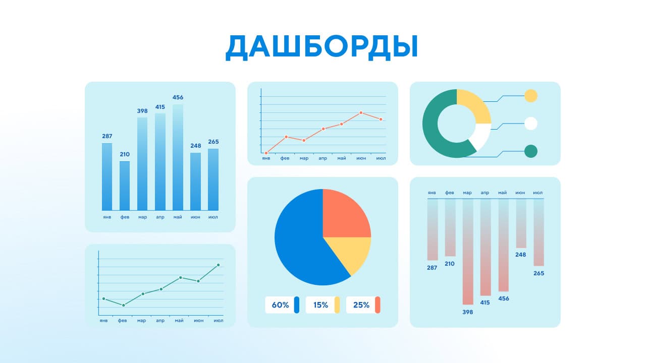 Дашборды. Фактически это готовые или динамически обновляемые отчёты, отображающие в графическом виде изменение или текущее состояние основных показателей бизнеса, команды, отдельных сотрудников и не только. В качестве опорных значений логично использовать KPI. Но в дашборде могут выводиться и другие метрики, помогающие в оценке прогресса проекта. Непосредственно визуализация осуществляется стандартными методами, описанными выше: диаграммы, графики, схемы и т.п.