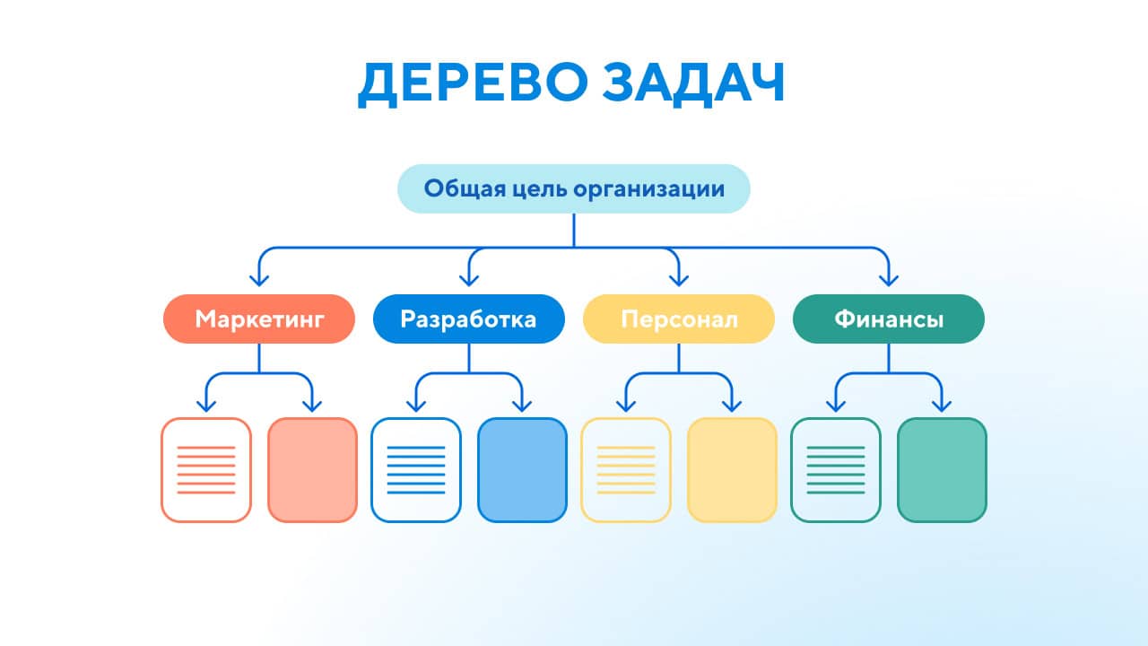 Дерево задач. Ещё один граф, но без привязки ко времени. Наглядно можно отобразить все задачи проекта и взаимосвязи между ними. Основная цель – отслеживание подчинённости и прогресса. Например, можно отобразить как исходная задача дробится и делегируется подчинённым.
