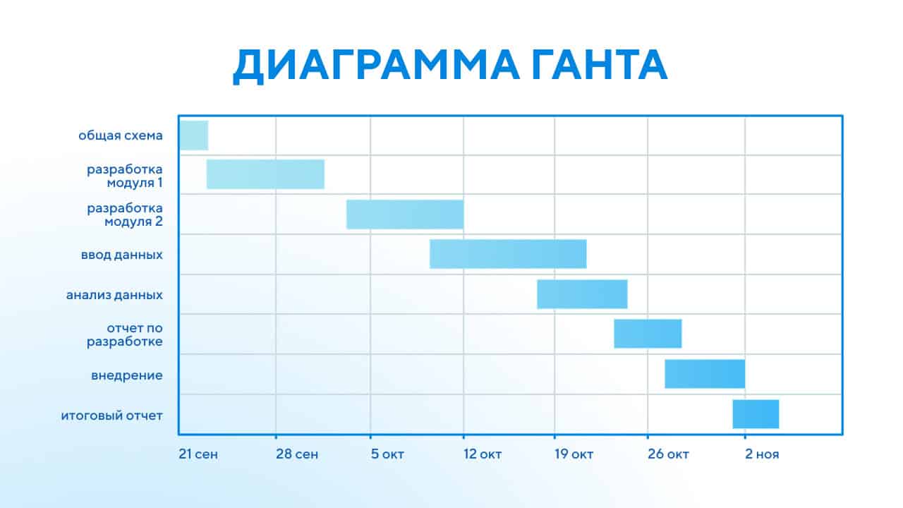 Сетевой график (диаграмма Ганта). Представляет собой сложную схему связи между всеми задачами проекта (такие фигуры или схемы называются графами). Для лучшего понимания сетевые графики рисуются с привязкой ко времени. Каждая задача имеет время начала и конца. С помощью дуг или стрелок обозначаются связи, это помогает понять, какая задача влияет на другие. С помощью сетевого графика проще отслеживать узкие места и планировать общую продолжительность проекта. Диаграммы Ганта – неотъемлемый элемент метода критического пути. При строгой иерархической структуре диаграмма отлично применяется для методологии Waterfall (водопад).
