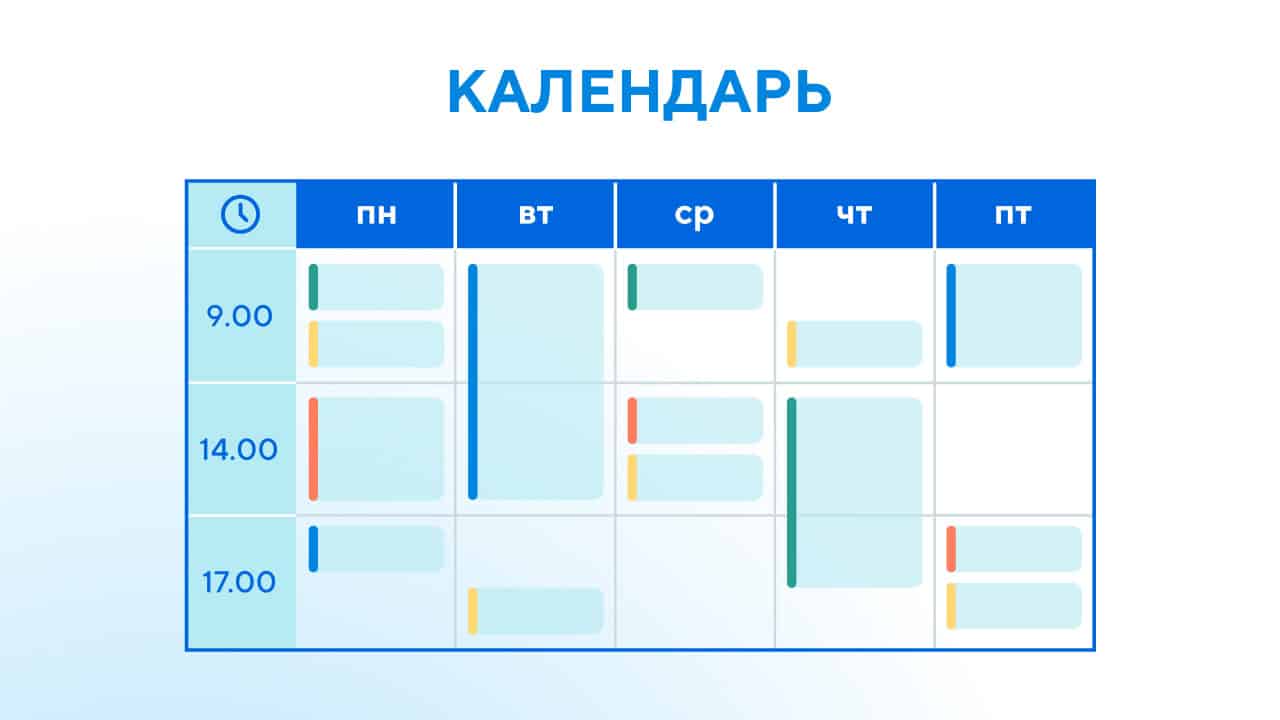 Календарь. Это список всех задач, дел, встреч и событий, разнесённых по дням месяца, недели, года, квартала или другого периода времени (в том числе возможно отображение всех задач внутри одного рабочего дня). С помощью календарного вида удобно смотреть текущую загрузку отдельного сотрудника, отдела, службы или всей команды проекта. Свободные слоты можно использовать для планирования общих встреч и новых дел.