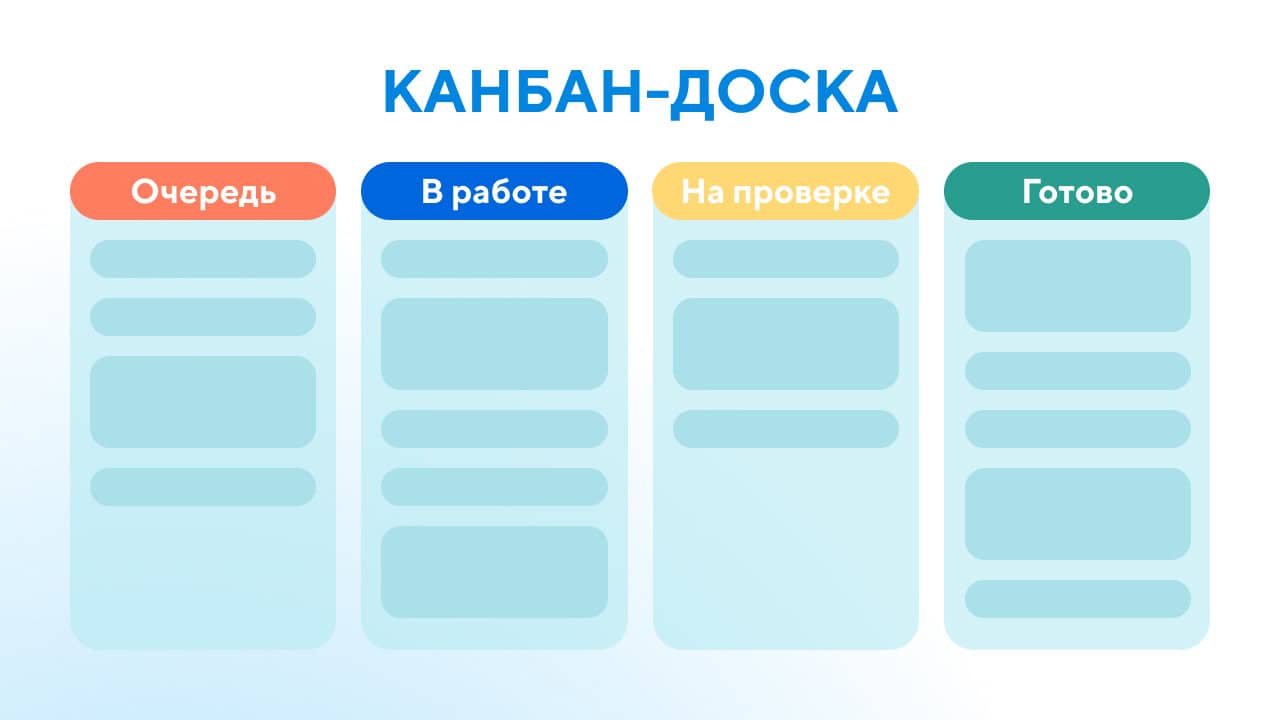 Канбан. Представляет собой таблицу или вертикальные столбцы, обозначающие этапы или статус задачи (цели, иного объекта), внутри которых расположены отдельные карточки задач (цели или иные объекты). Перемещение отдельно взятой задачи из одного столбца в другой происходит после смены статуса. Следовательно, руководитель и команда проекта могут легко определить, какие задачи есть в работе и на какой стадии они находятся. По аналогии работают воронки продаж в маркетинге, только вместо задач по колонкам двигаются контакты иди сделки. Количество колонок должно строго соответствовать количеству статусов задач. Kanban-доски могут быть физическими или виртуальными. Этот инструмент визуализации достаточно часто применяется в Agile-проектах (почти во всех гибких методологиях). Помимо непосредственно самой задачи в карточке может быть любая другая дополнительная информация (ответственное лицо, дедлайны, краткое описание и т.п.).