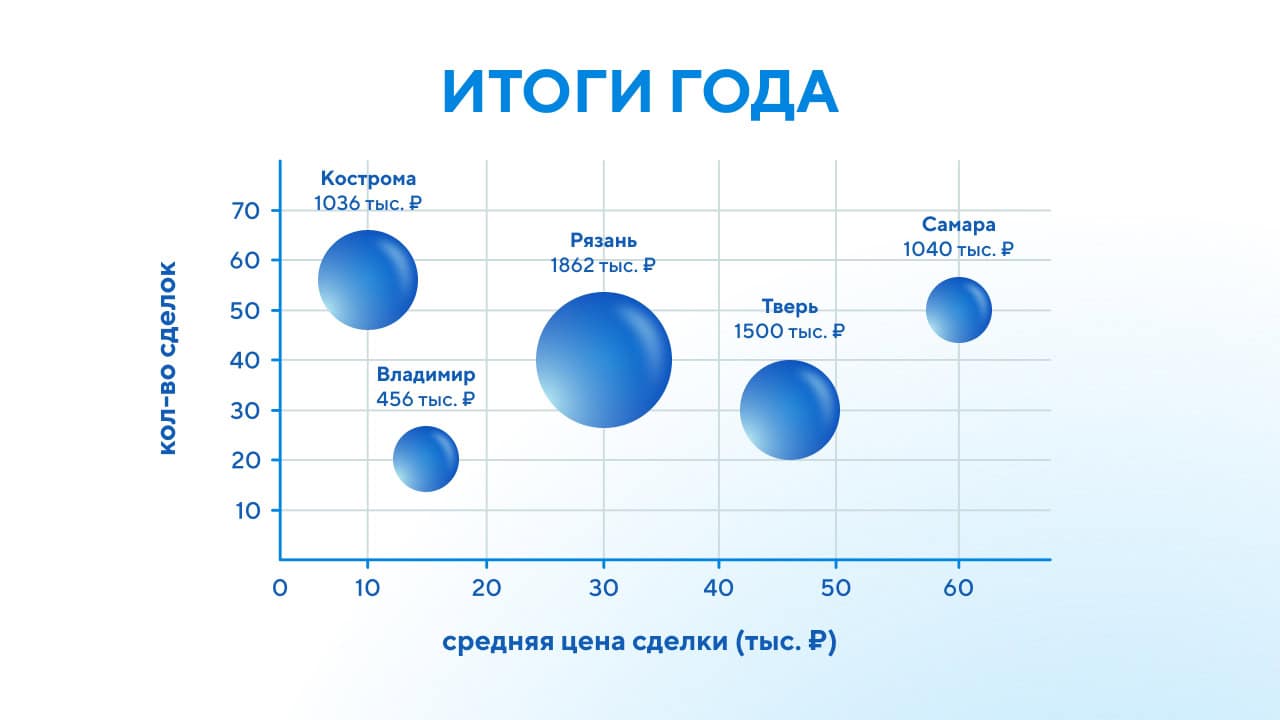 Пузырьковые диаграммы (обеспечивают визуализацию наиболее сложных финансовых и прочих данных, позволяют работать одновременно с 4 разными метриками).