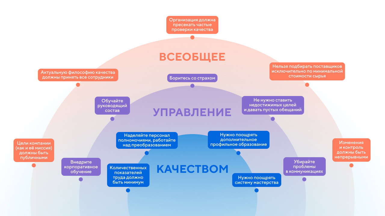 - Концепцию Деминга (он выделял 5 «смертельных болезней» компании и 14 принципов, которые помогали с ними бороться).
