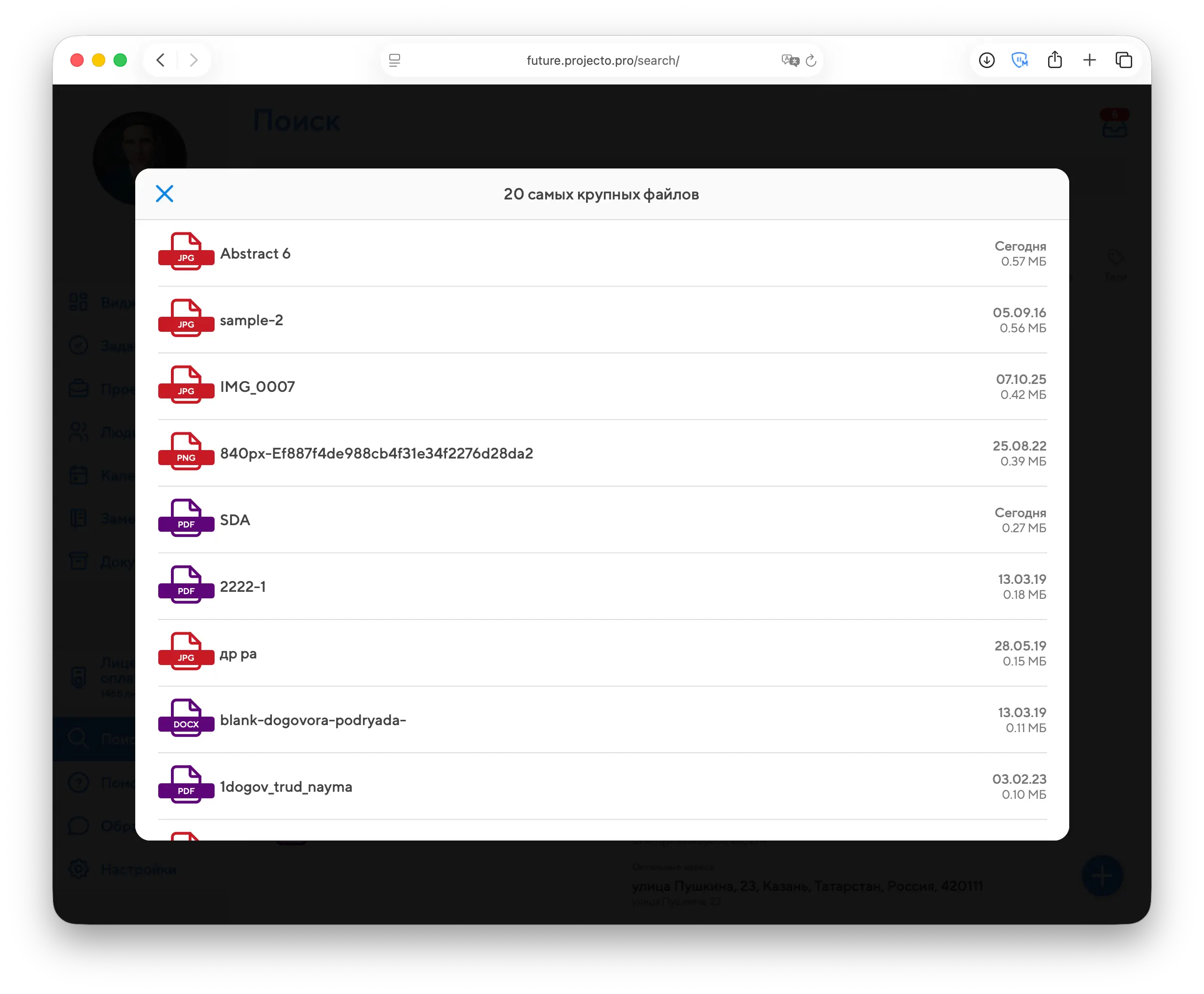 Администраторы Projecto имеют право удалять самые крупные файлы через раздел "Настройки - Администрирование", кнопка "Показать самые крупные файлы".