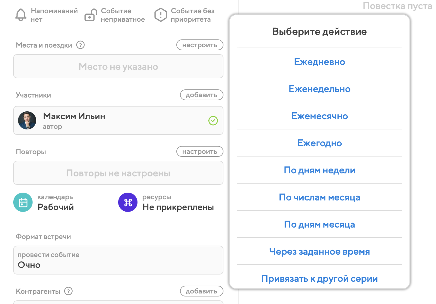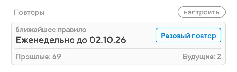 Иногда бывает нужно провести внеочередной повтор события, не затрагивая общее расписание – например, если в ходе совещания не успели обсудить что-то важное, но передвигать следующий повтор неудобно. В таких случаях вы можете создать повтор события вручную.