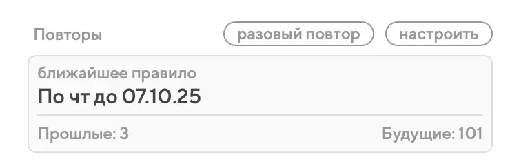 В отличие от задач, у которых следующий повтор создаётся по завершении предыдущего, для повторяющихся событий создаются сразу все нужные повторы – чтобы их было видно в календаре на будущие дни, недели или месяцы. Поэтому при создании повторяющегося события обязательно нужно указать, до какой даты оно должно повторяться.