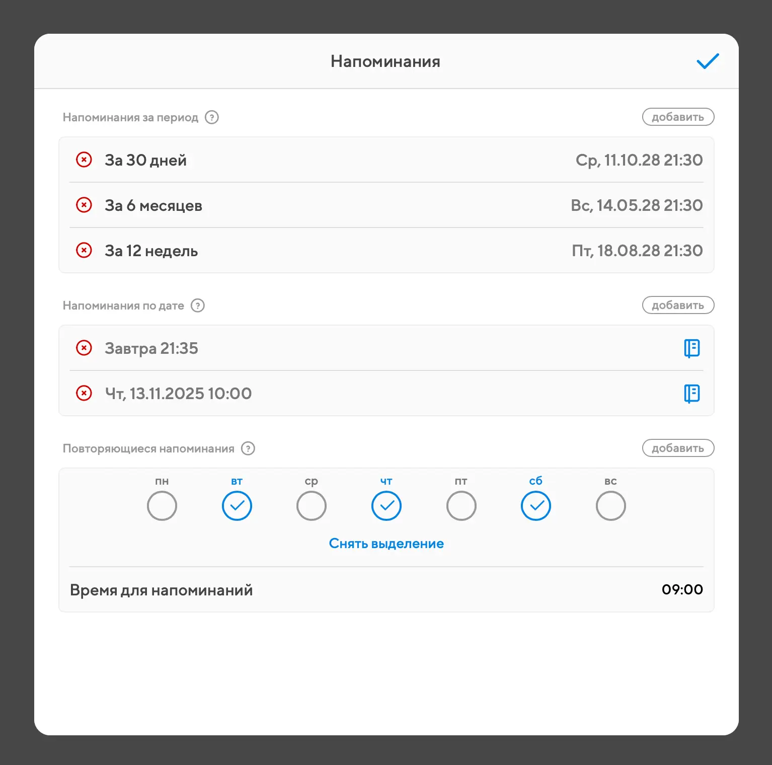 Удалить ошибочно добавленное напоминание можно с помощью крестика рядом с ним.