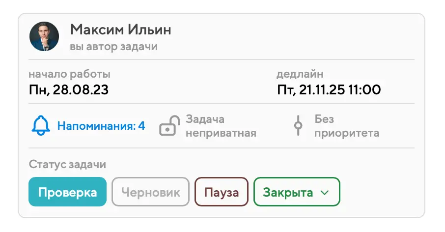 Напоминания в Projecto может настроить любой из тех, кто видит задачу. Более того, если у задачи есть несколько подзадач с разными сроками, то напоминания могут быть настроены по каждой из них отдельно.