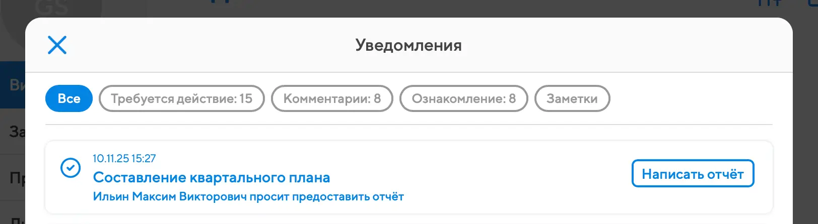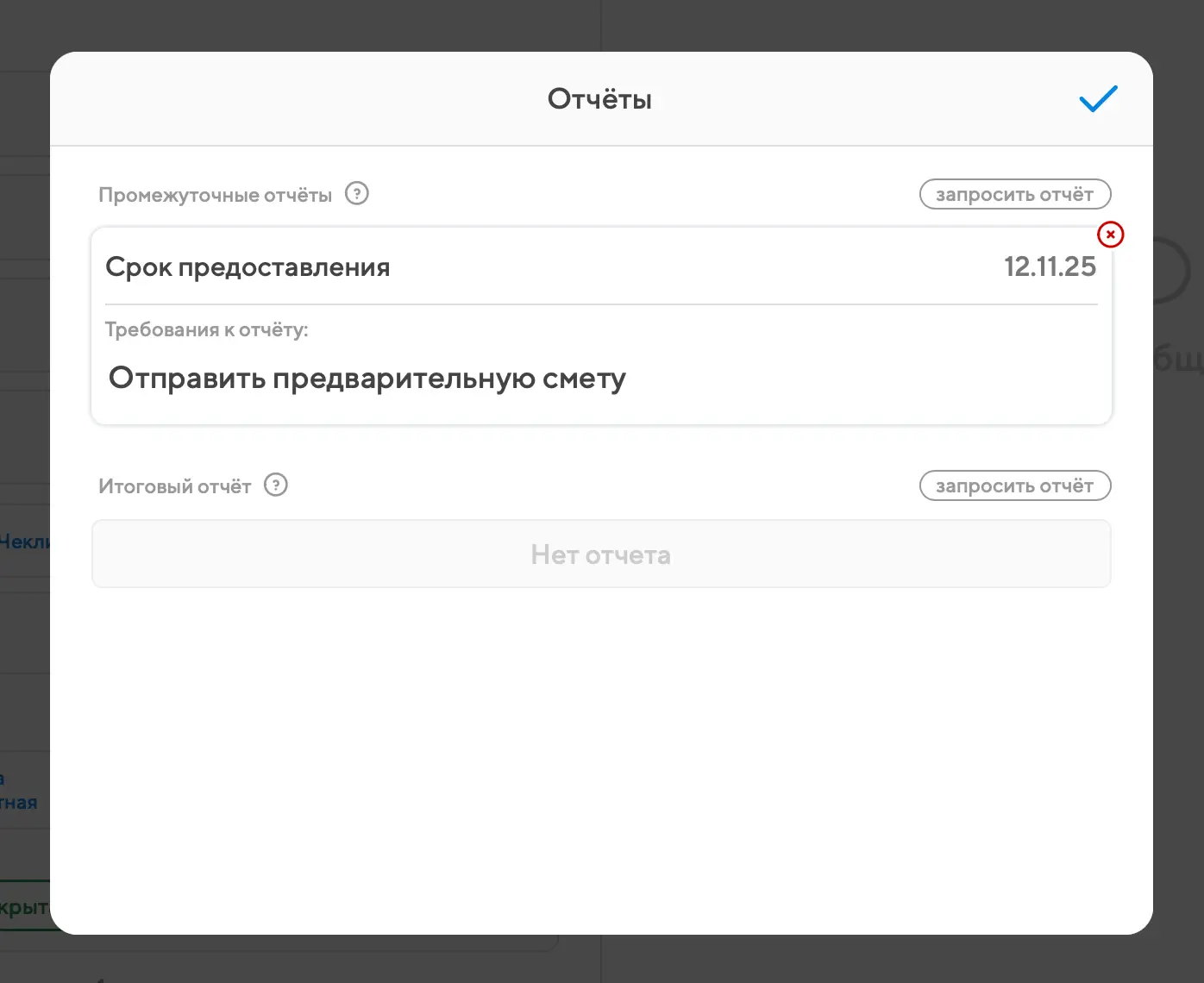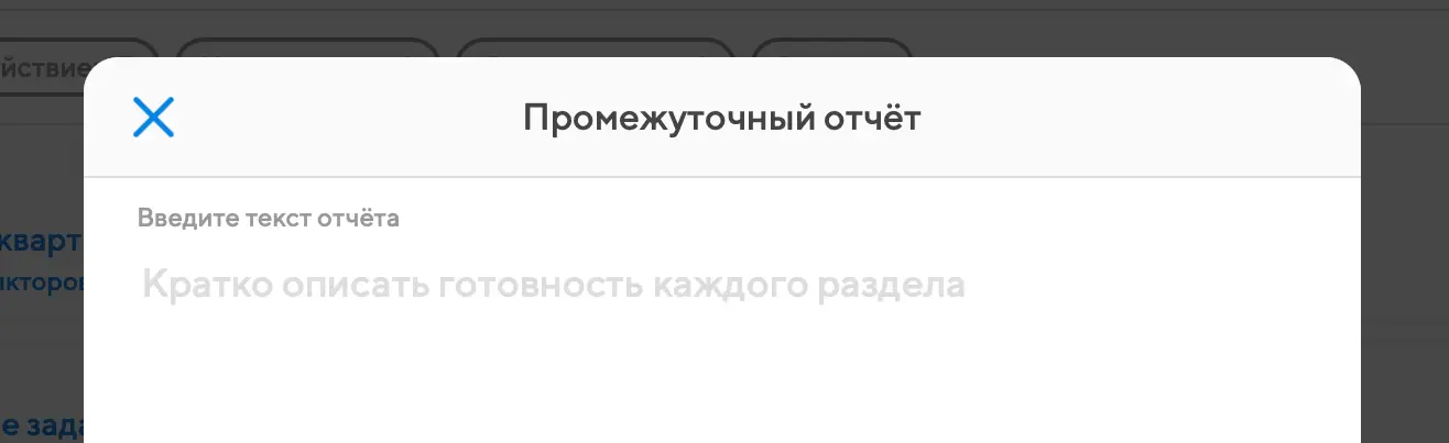 Итоговые отчёты по задачам устроены так же, как промежуточные, но запрашиваются не по датам, а в момент сдачи задачи на проверку. Если запрошен итоговый отчёт, то исполнителю недостаточно просто поменять статус задачи, он сразу должен будет указать, что именно было сделано. Но написать итоговый отчет можно и через окно запрошенных отчетов, нажав на кнопку запрошенных отчетов, в виде листа бумаги.