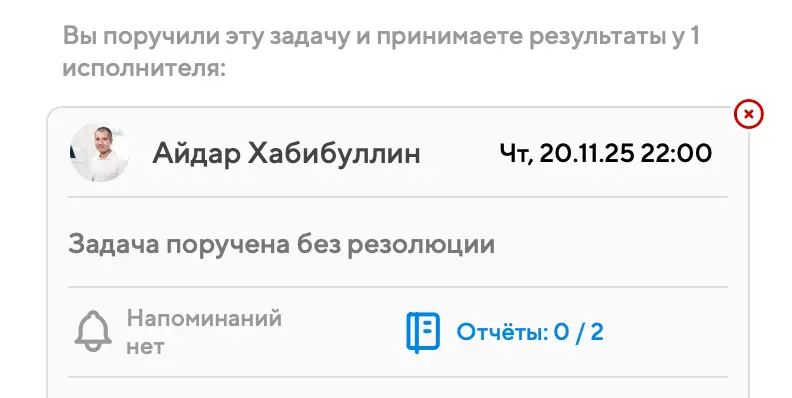 Запрашивать отчёты лучше всего при создании или перепоручении задачи, но можно сделать это и позже – до того момента, как задача или подзадача перейдёт в завершающие статусы. Чтобы настроить отчёт, нажмите на кнопку запроса отчета, в виде листка бумаги, в окне свойств задачи в блоке интересующей вас задачи или подзадачи: