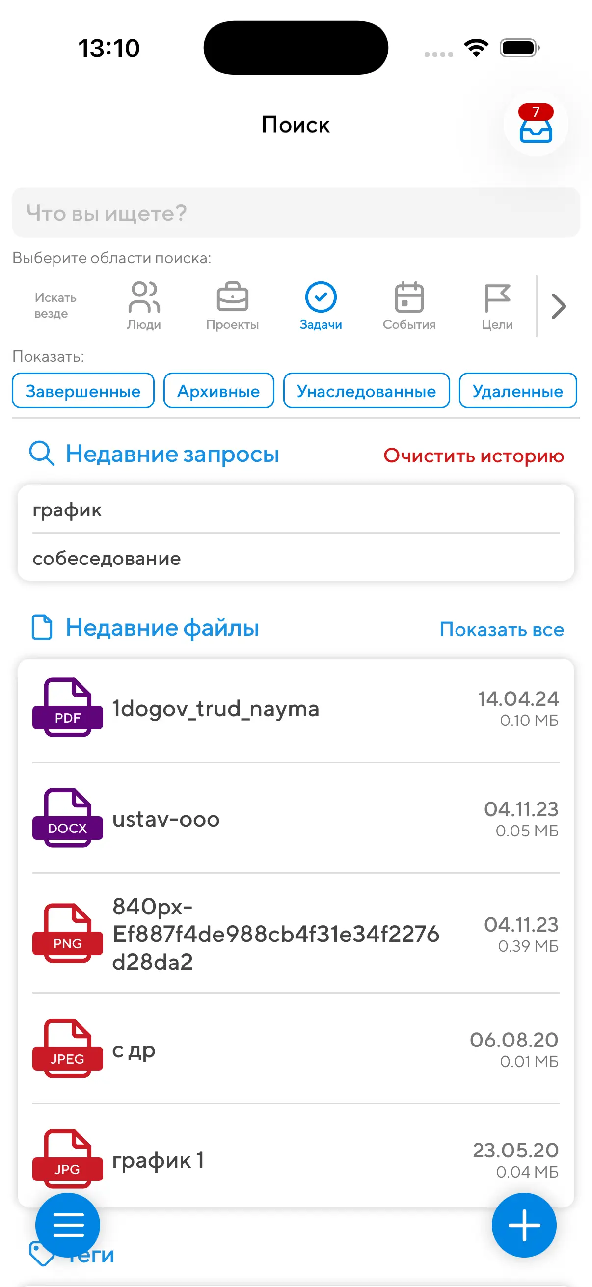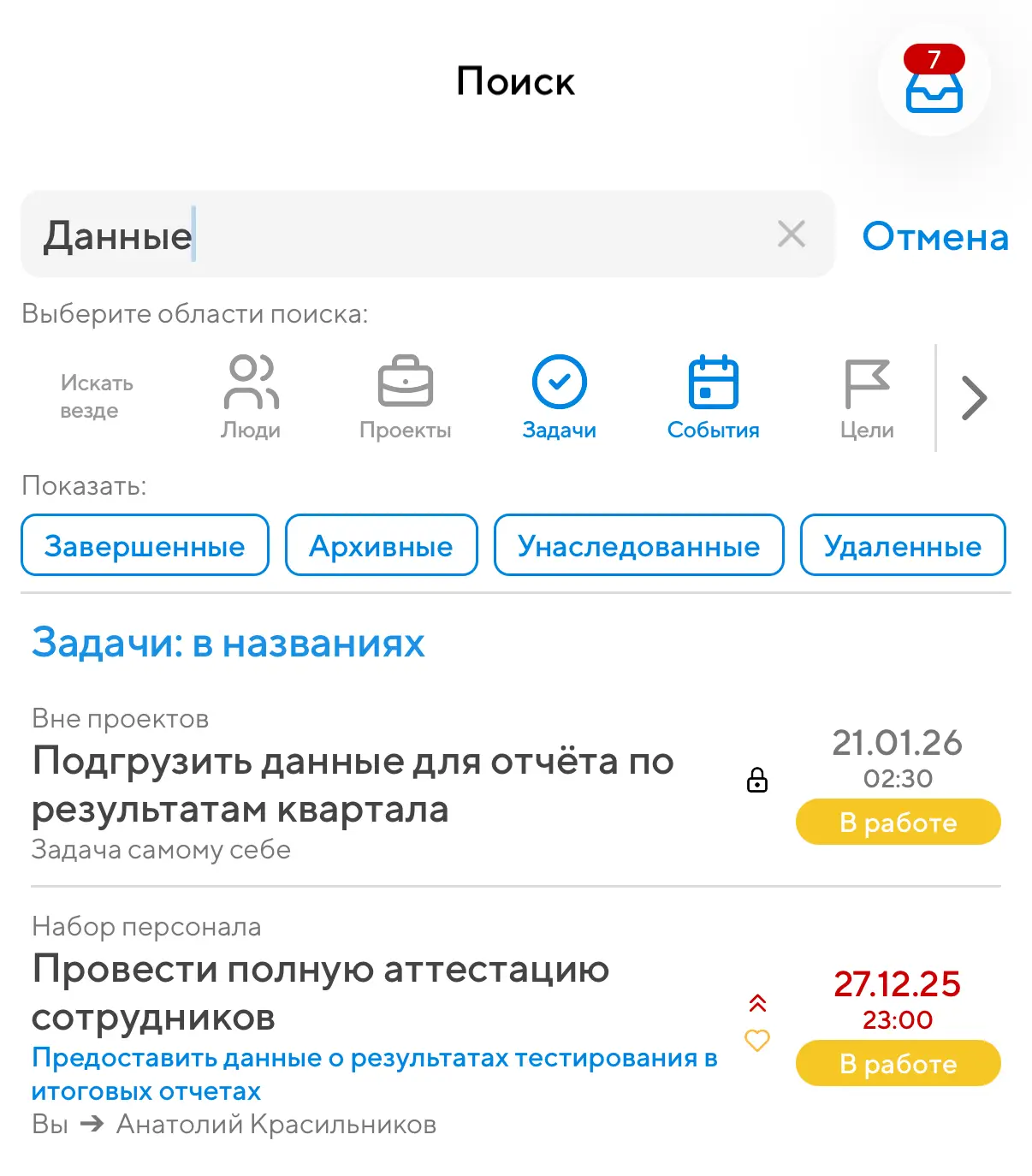 После ввода поискового запроса и нажатия на клавишу Enter появляется всплывающий список с результатами поиска, отсортированный по убыванию даты создания сущности. Список результатов разделен на секции: задачи, события, заметки и т.д. Поиск происходит по всем сущностям, к которым вы имеете доступ.
