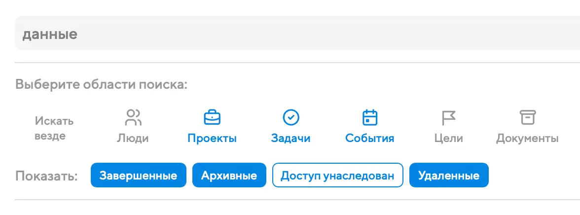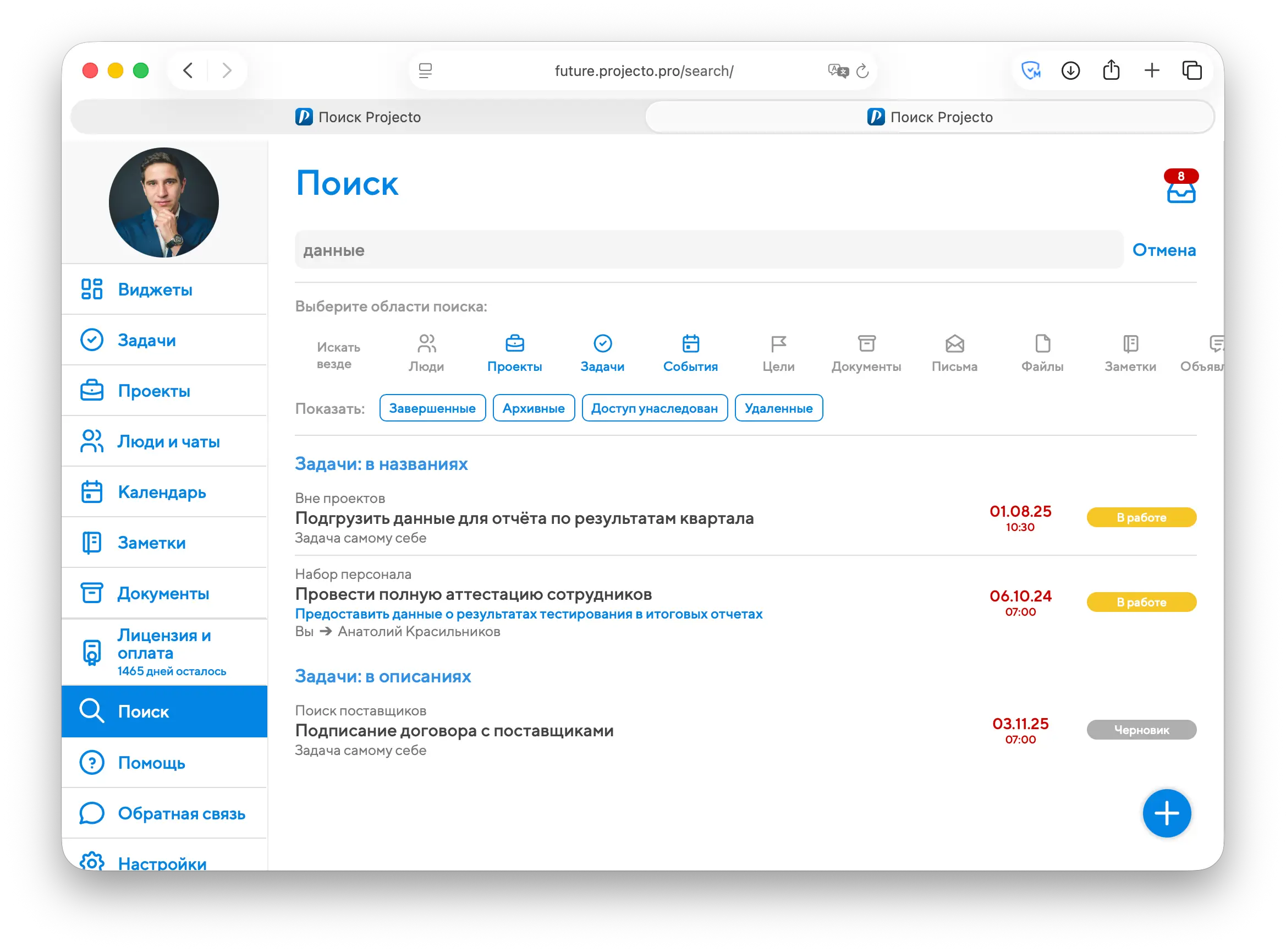 Для поиска сразу по всей информации в Projecto пользуйтесь универсальным полем поиска в разделе “Поиск”.