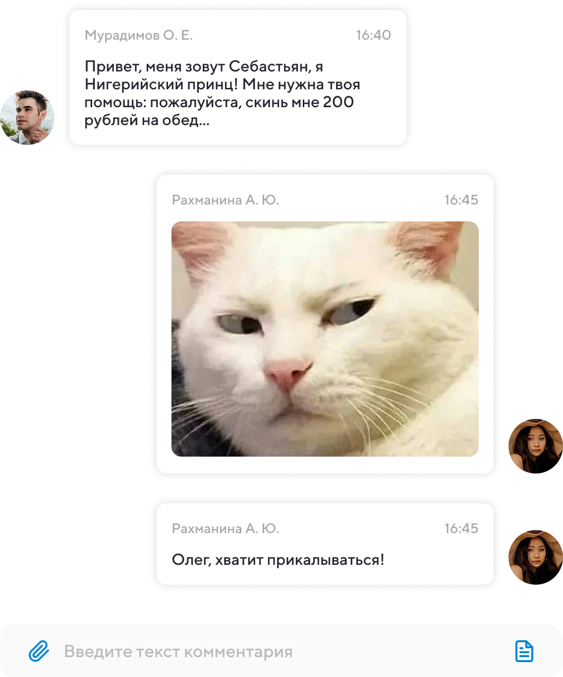 Интерфейс подстроен под рабочую среду. Спамить мемами можно, а вот мошенники не пройдут.