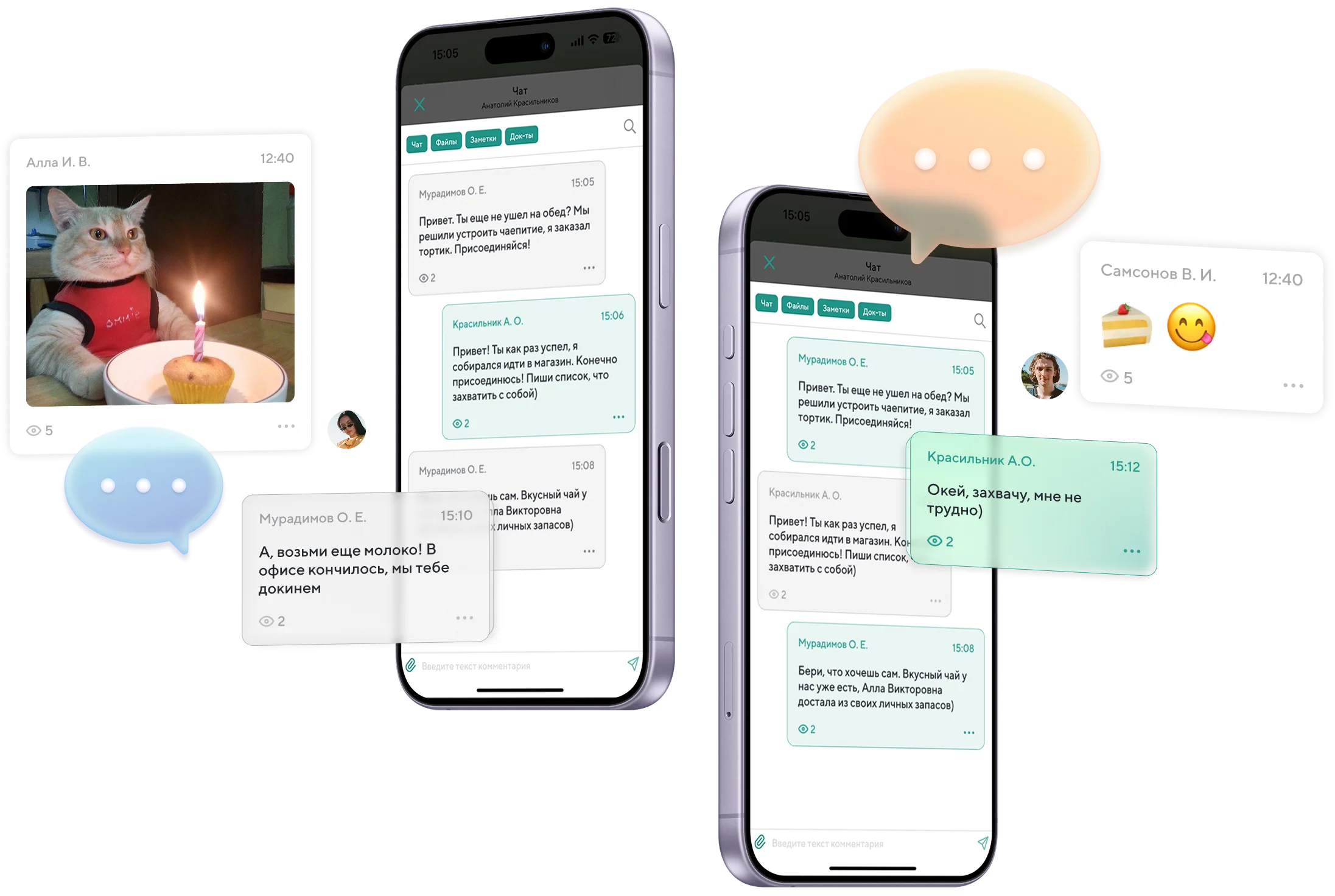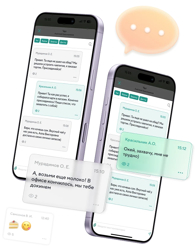 Обсуждайте задачи, общайтесь в событиях и личных чатах — всё внутри одной платформы, чтобы работа команды была прозрачной, а важные решения не терялись в разных приложениях