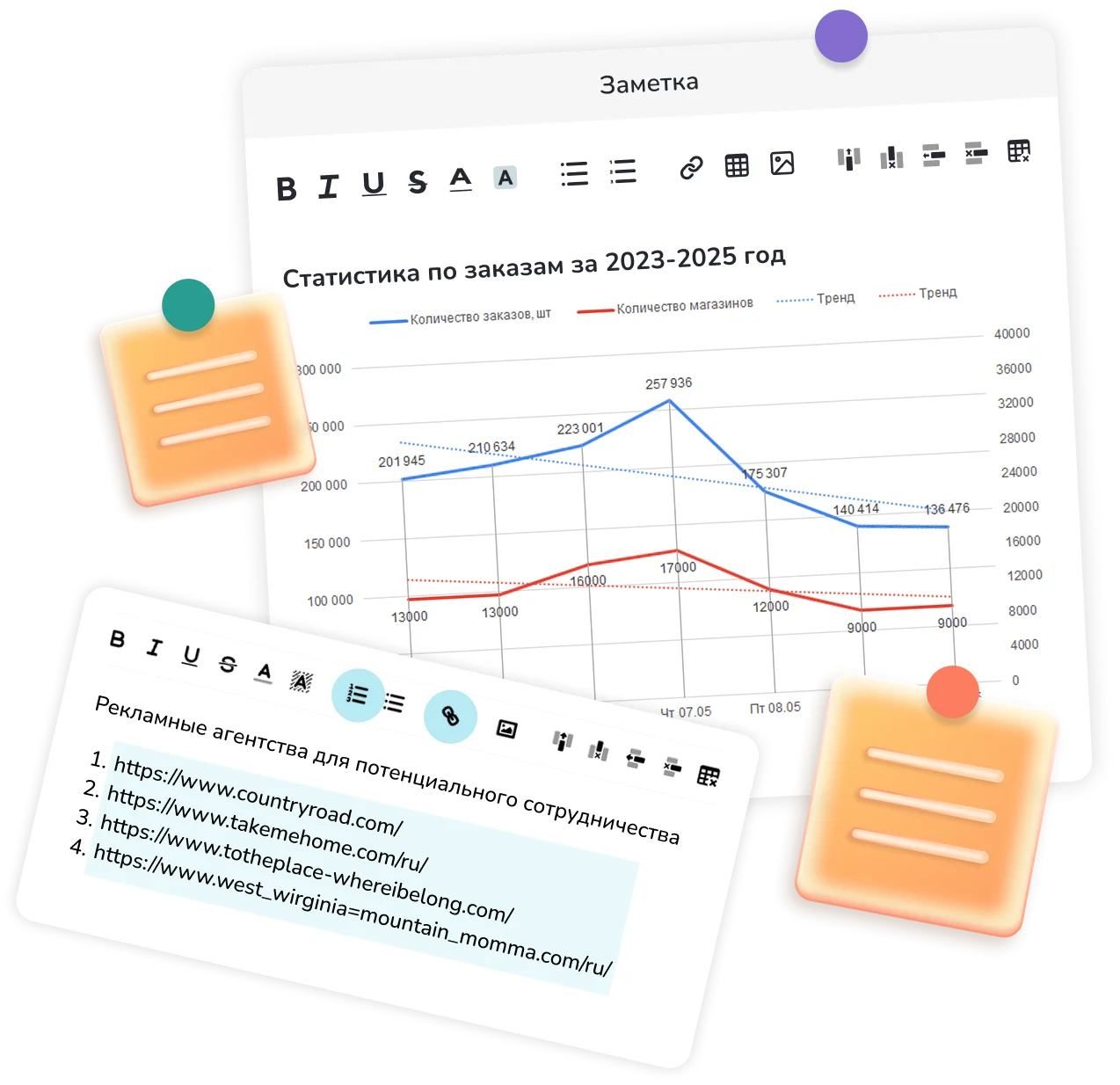 Всё, как в любимых редакторах. Выделяйте, маркируйте, создавайте списки, работайте в заметках.