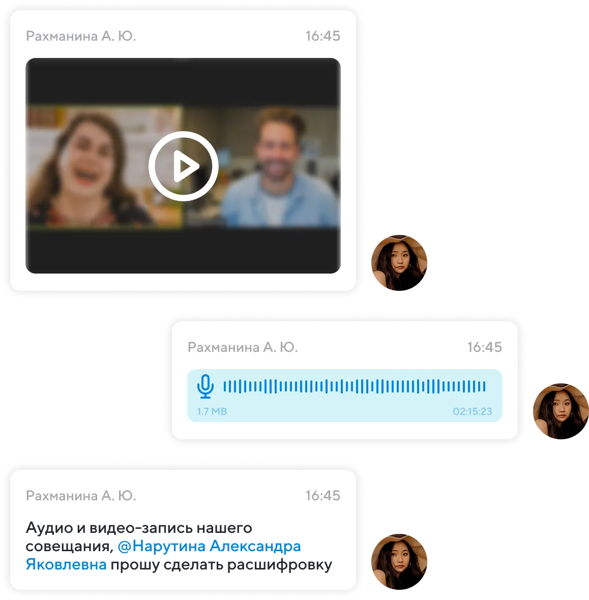 Записывайте аудиосообщения, снимайте видео в чат с коллегами. Это понятнее и быстрее, особенно когда нужно объяснять на пальцах.