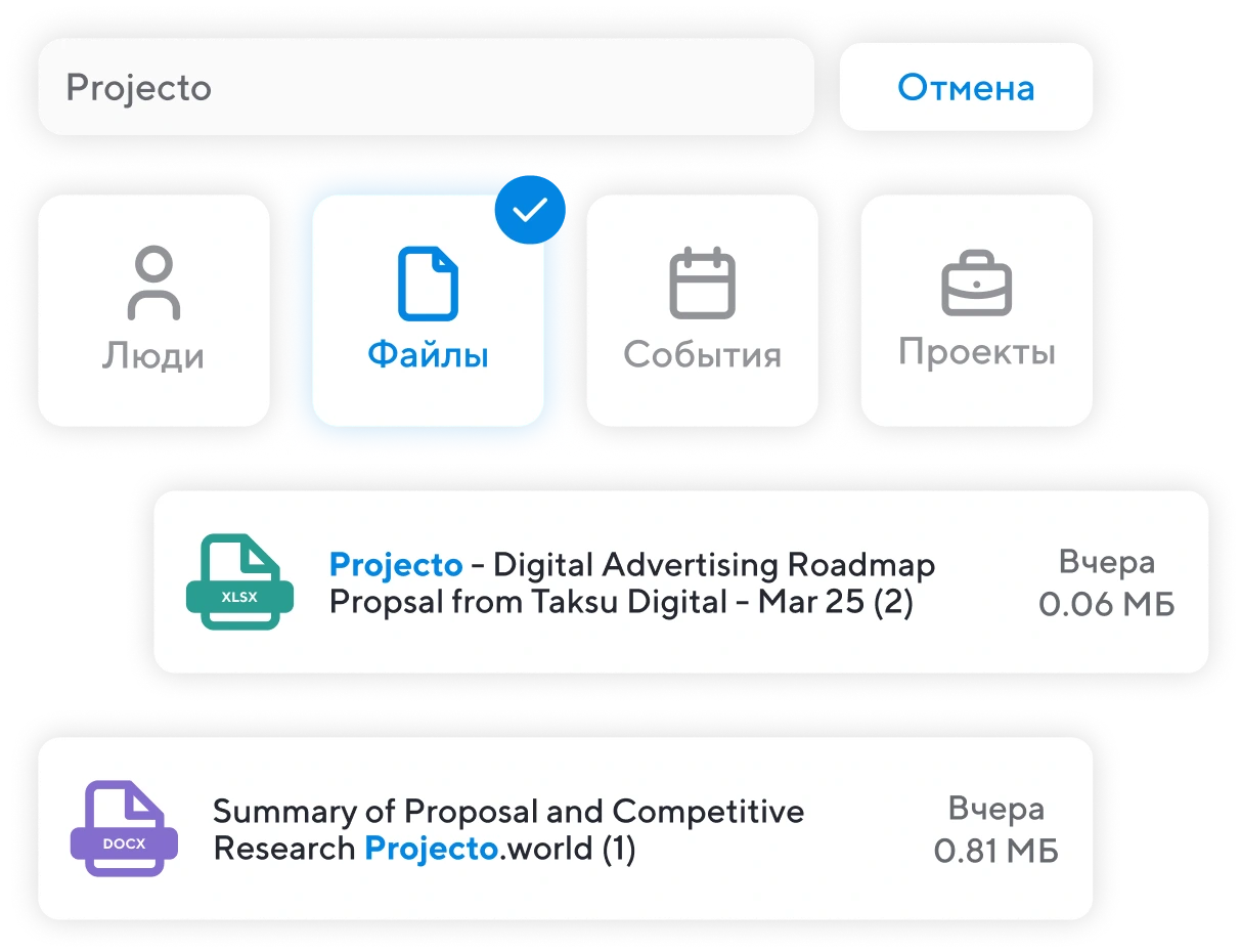 Не нужно искать тот самый документ в почте или по чатам — всё легко хранить и искать в Projecto