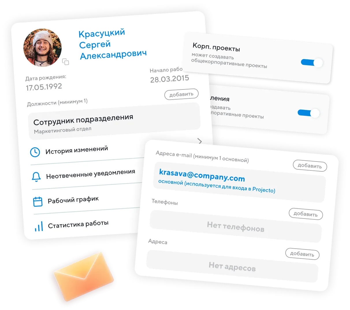 Профиль коллеги включает в себя роль, подразделение, контакты, права доступа и данные отпусков