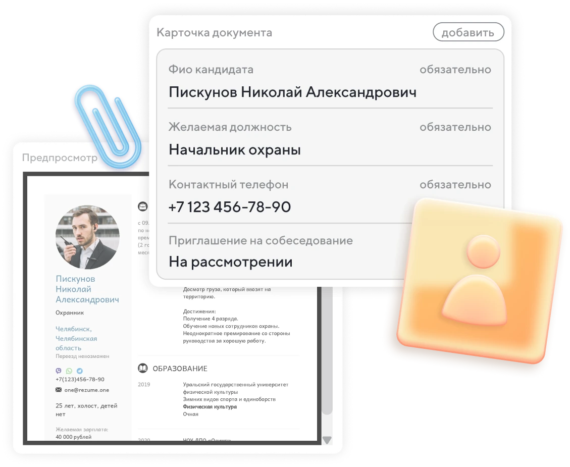 Загружайте резюме в Projecto как документ‑карточку: ФИО, контакты, позицию, источник отклика