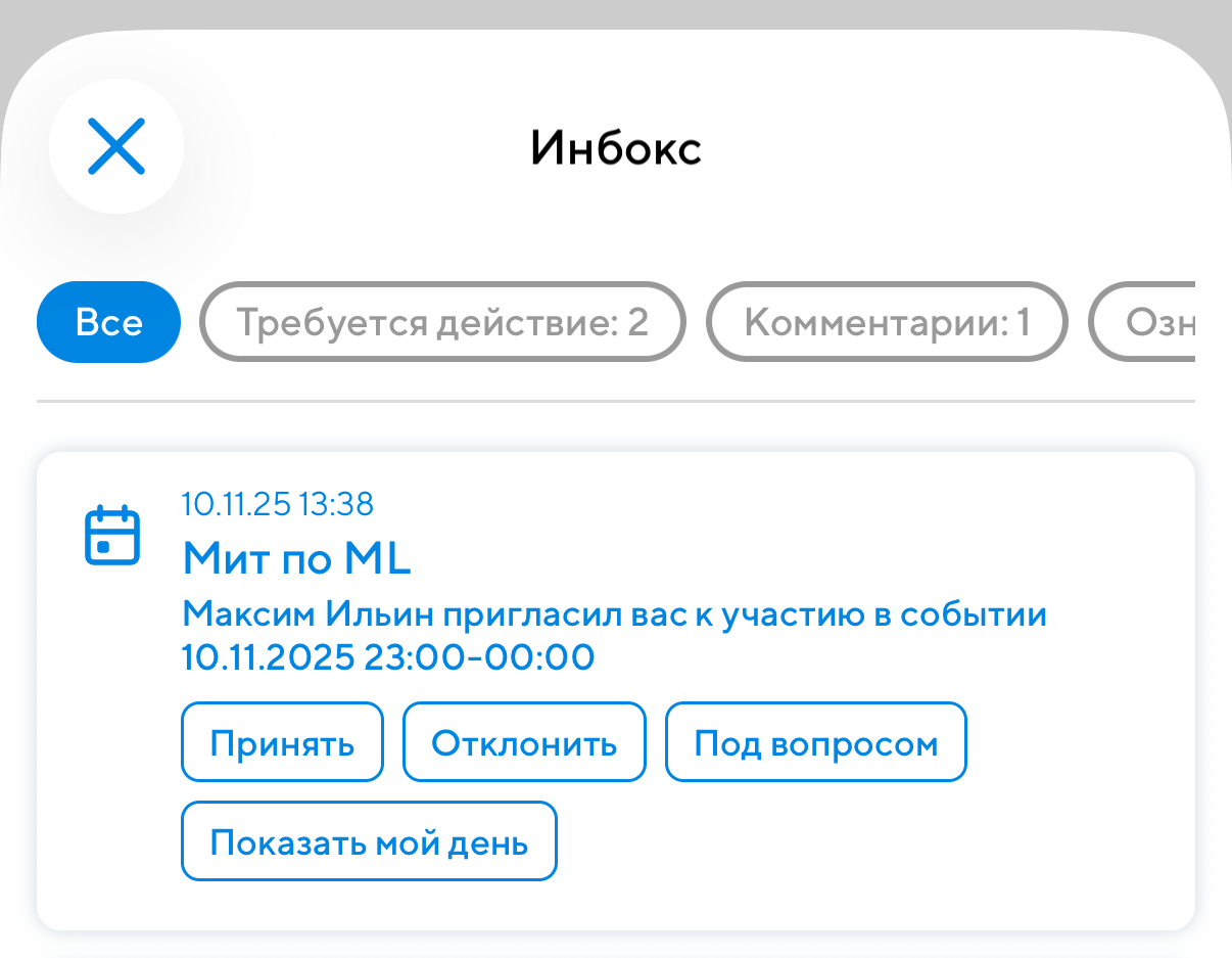 Если вы считаете, что вас ошибочно пригласили в событие, или вы понимаете, что точно не можете участвовать в нём в назначенное время, вы можете отказаться от участия. Для этого во всплывающих уведомлениях, в разделе "Уведомления" в инбоксе и в окне свойств события предназначена кнопка "Отклонить".
