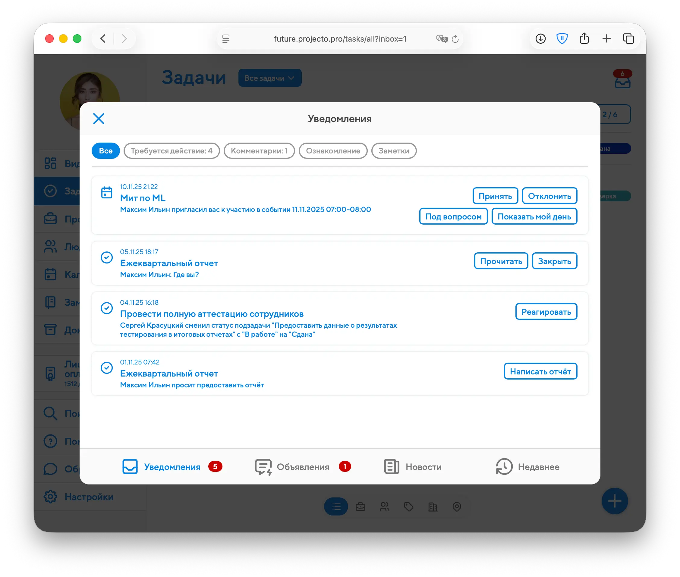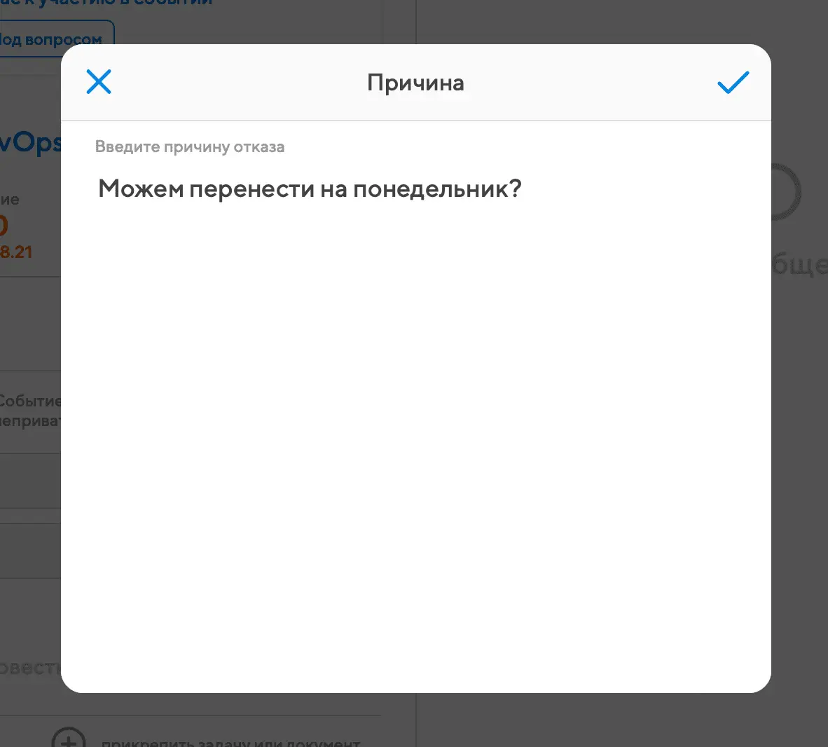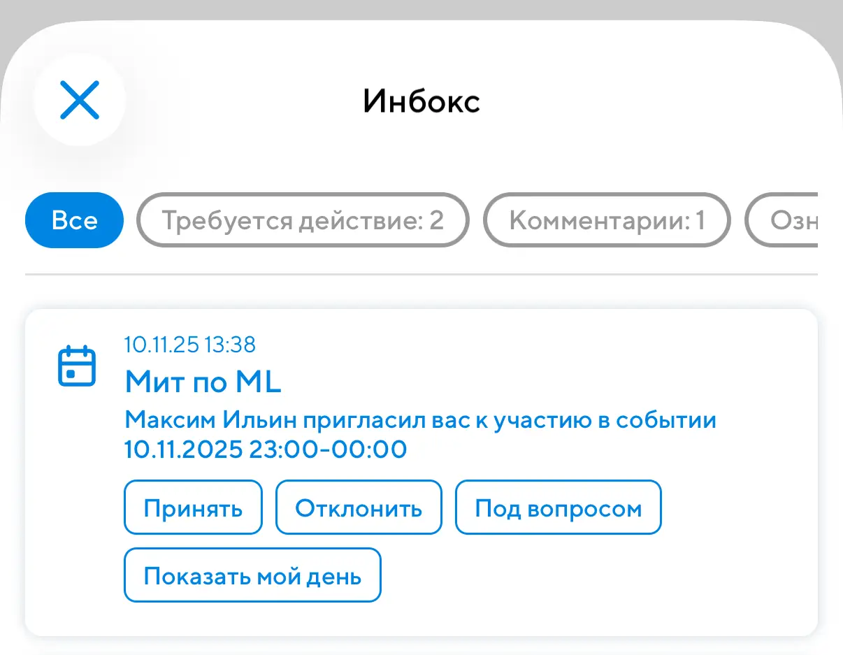 Если вы считаете, что вас ошибочно пригласили в событие, или вы понимаете, что точно не можете участвовать в нём в назначенное время, вы можете отказаться от участия. Для этого во всплывающих уведомлениях, в разделе "Уведомления" в инбоксе и в окне свойств события предназначена кнопка "Отклонить".