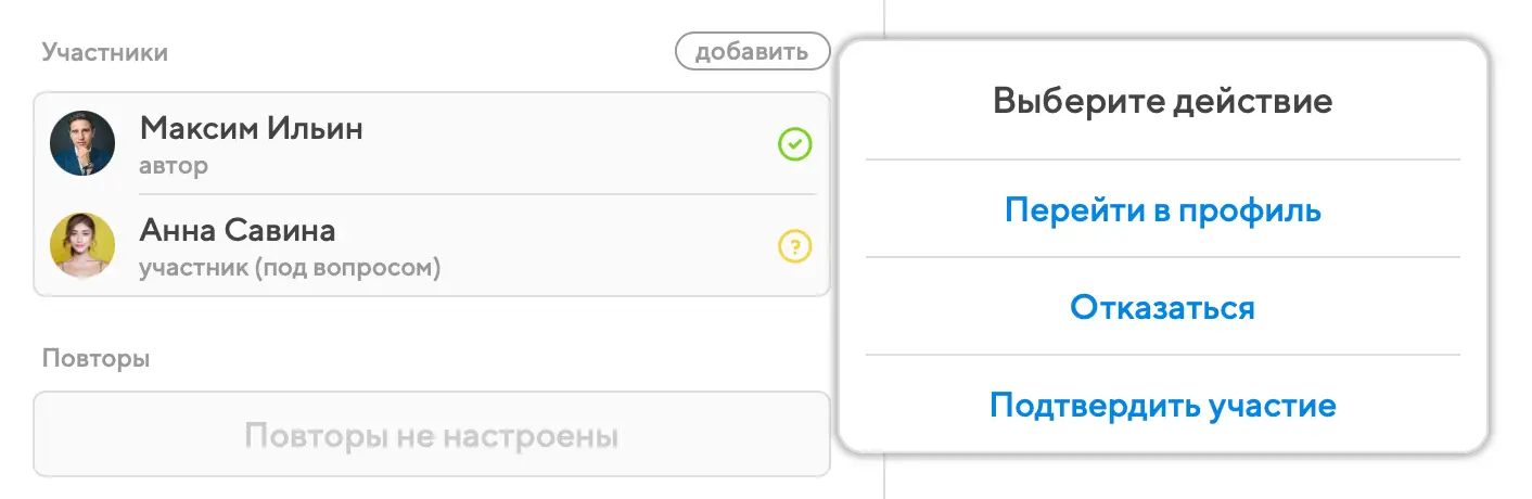 Если вы не уверены, что сможете участвовать в событии, выберите вариант "Под вопросом", но не игнорируйте приглашение. Когда вы определитесь с планами, вы сможете поменять свой ответ на приглашение в окне свойств события: