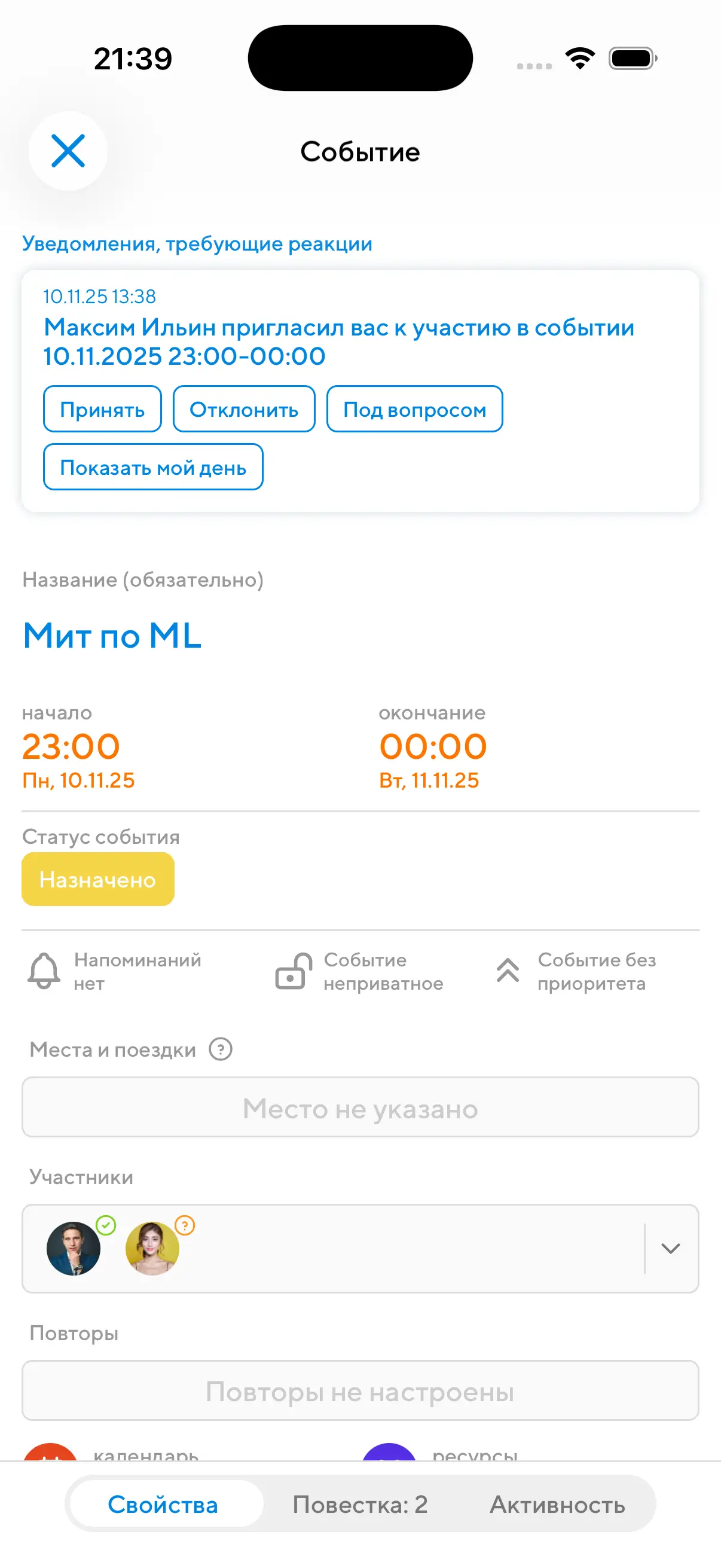 Для работы с приглашением в событие в первую очередь тоже следует принять полученное уведомление. Как и в случае с задачами, это можно сделать сразу двумя способами: