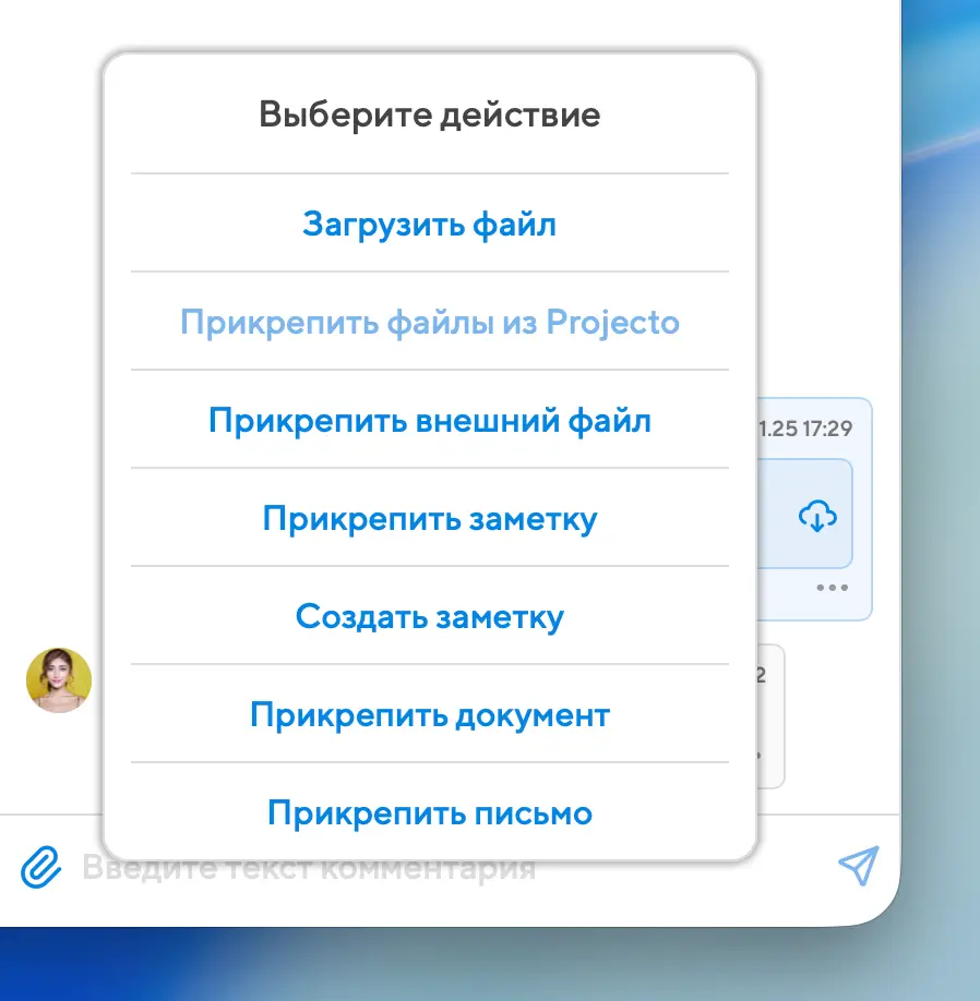 Другой способ (например, если вы хотите прикрепить файл, ранее добавленный в Projecto) – кнопка-скрепка в поле добавления нового комментария, в нижней части правой колонки окна свойств задачи: