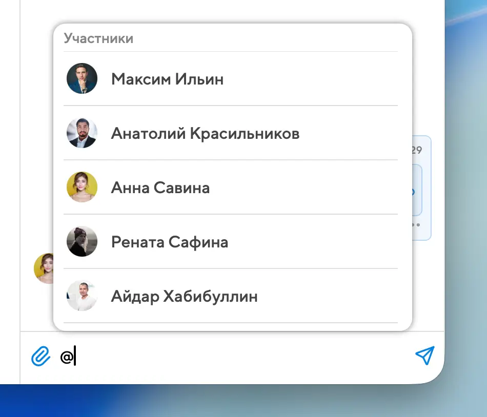 В тексте комментария можно упомянуть другого пользователя, нажав на кнопку @, а потом выбрав человека: