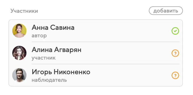 При приглашении участников и наблюдателей в событие им будут высланы уведомления с возможностью принятия и отклонения участия в событии. Удалить участника автор может нажатием по ФИО в списке участников.
