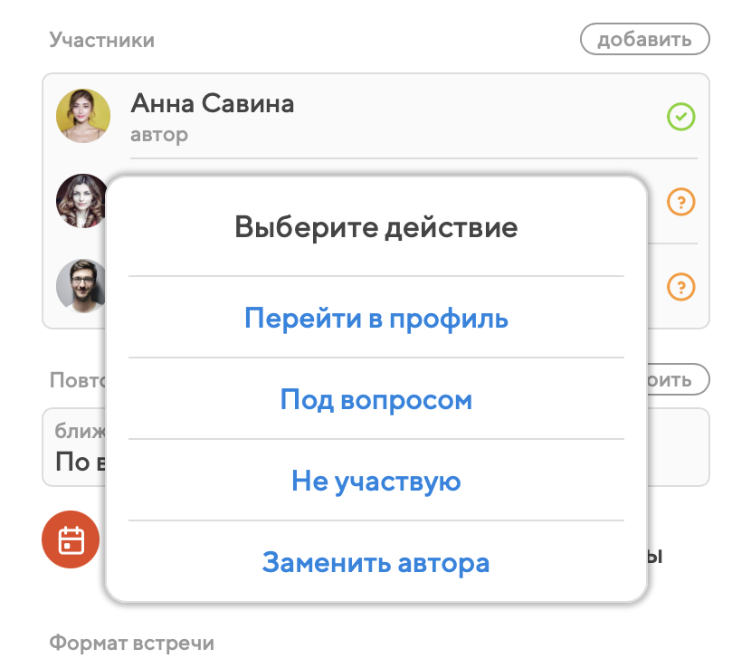 В том же меню можно выбрать пункт "Под вопросом", чтобы дать понять остальным участникам события, что вы не уверены насчёт того, что сможете присутствовать.