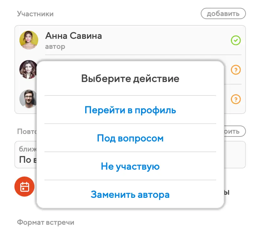 В том же меню можно выбрать пункты "Не участвую" и "Под вопросом", чтобы дать понять остальным участникам события, что вы не уверены насчёт того, что сможете присутствовать, или точно знаете, что не придете, и хотите, чтобы событие провели без вас.