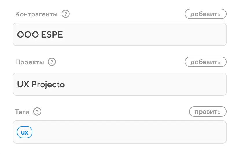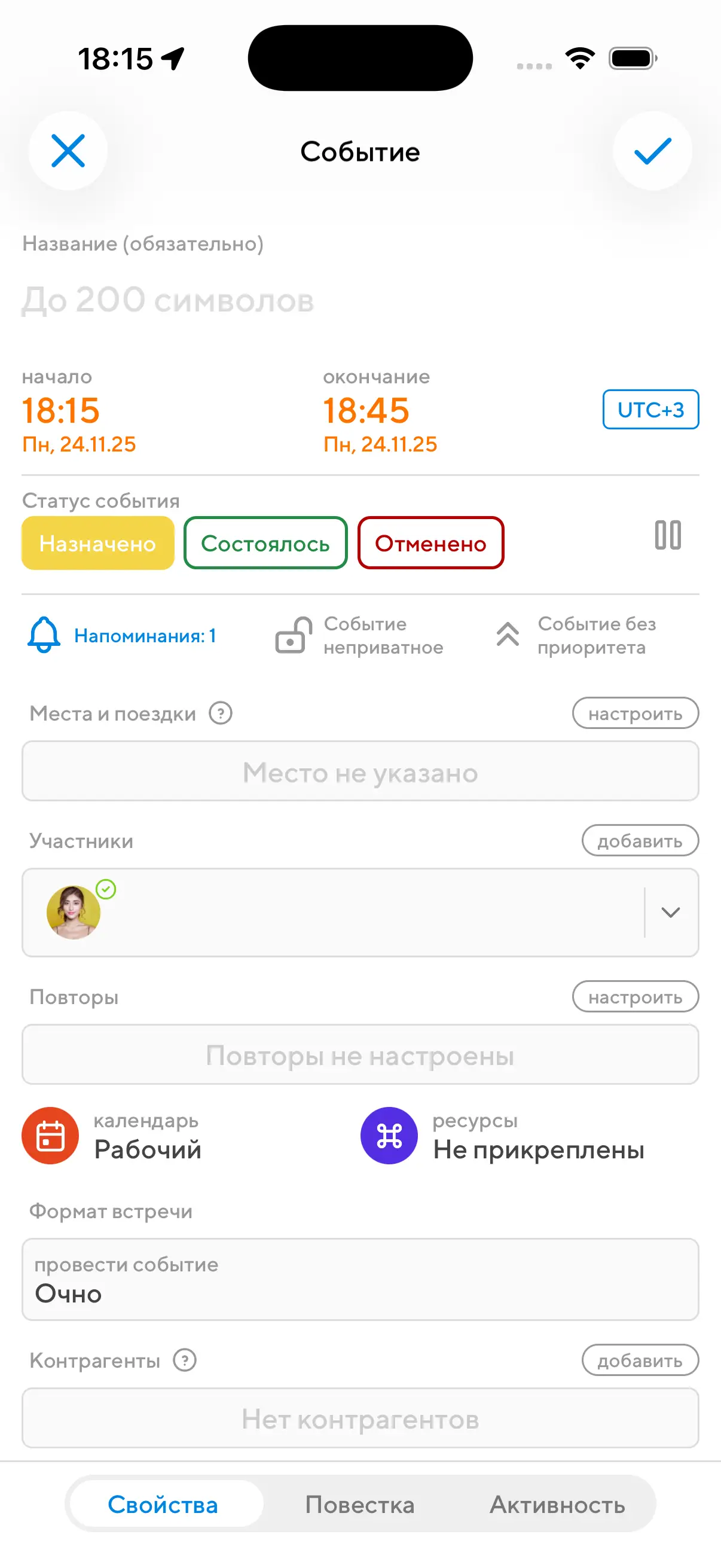 Контрагенты – как и задачу, событие можно связать с любым количеством контрагентов (компаний или юрлиц, как собственных, так и сторонних), указав их в этом блоке.