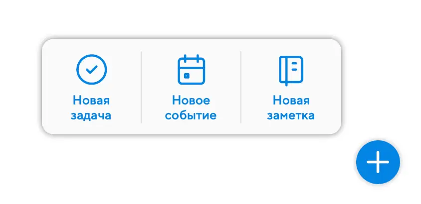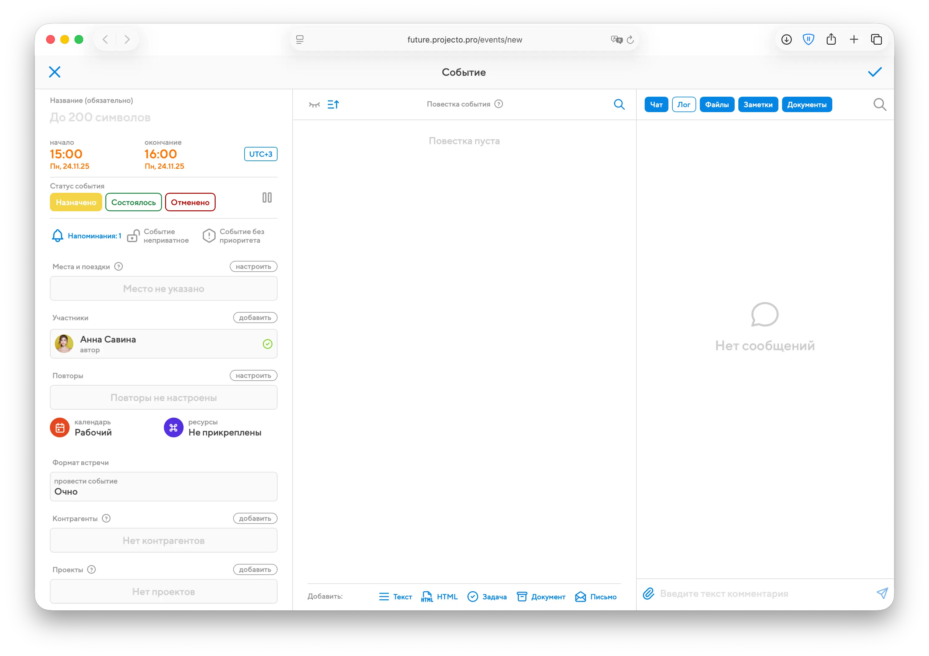 Откроется окно создания события. Как и в задачах, все параметры события разделены на три колонки. Название события, кнопки сохранения и закрытия отображаются наверху над ними. В мобильной версии элементы расположены в один столбец без разделения на колонки.