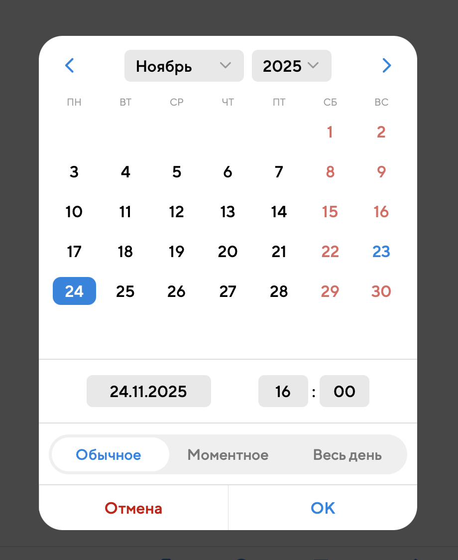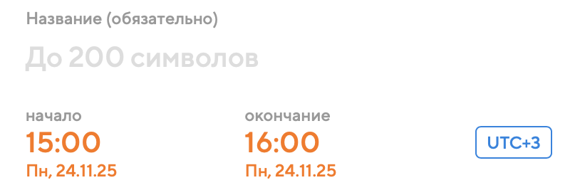Начало и окончание – обязательные к заполнению поля для любого события. Если у события нет чёткого времени начала и окончания (например, это командировка), можно включить опцию "Весь день", тогда начало и окончание события заполнятся автоматически.