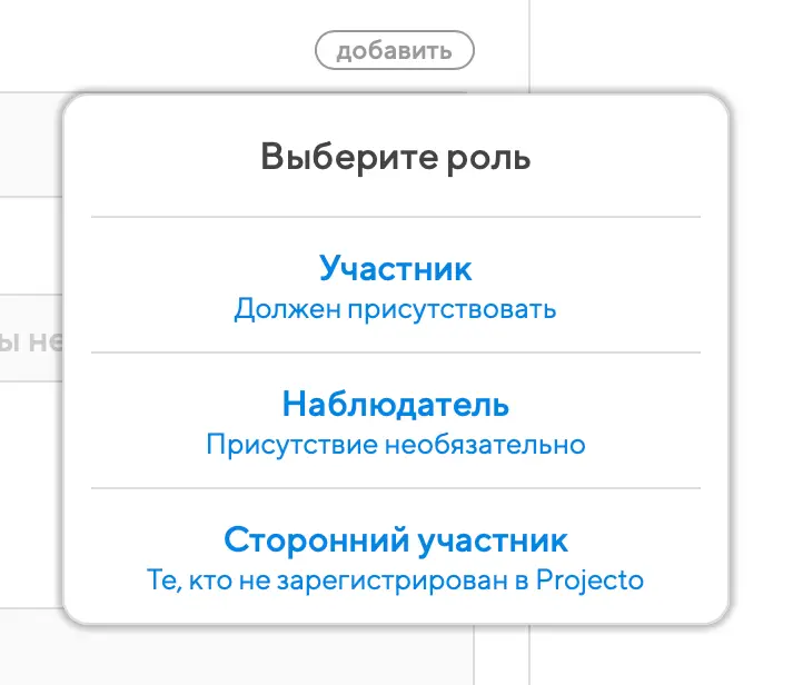 Кроме того, в Projecto предусмотрена возможность пригласить в событие даже тех, кто не зарегистрирован в Projecto. Для этого есть опция "Сторонний участник", при выборе которой вас попросят указать почту, на которую будет выслано приглашение и ICS-файл с параметрами события Projecto. Так сторонний участник сможет добавить его в приложение для календаря, которым он привык пользоваться.