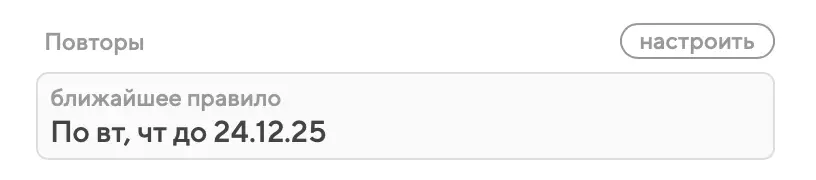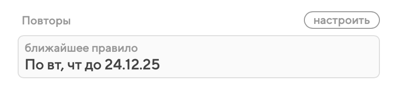 В блоке "Повторы события" вы можете настроить событие так, что его копии заполнят ваш календарь вплоть до выбранной вами даты. Подробнее о повторах событий вы можете прочитать в этой главе.
