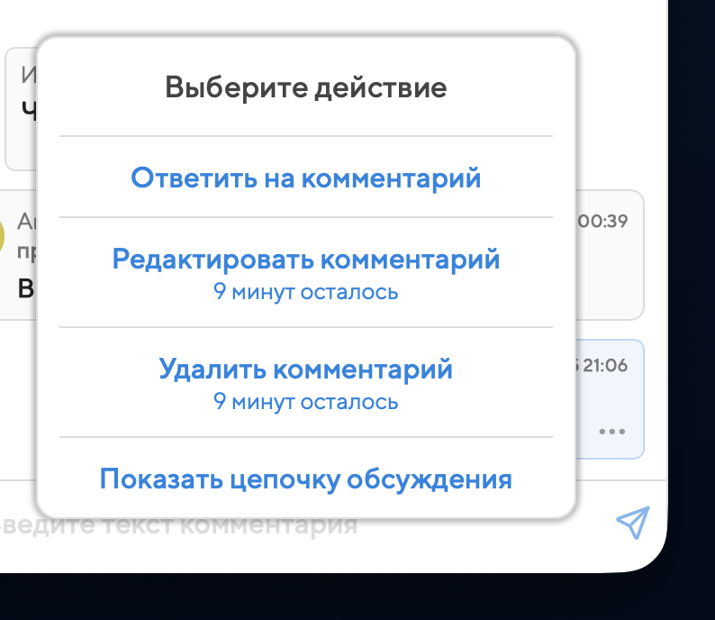 Автор и организатор события могут скрывать любые комментарии в чате, остальные сотрудники - только свои. Сделать это можно в течение 10 минут после публикации комментария нажатием на 3 точки и выбором соответствующей опции. После этого комментарий отображается бледным, а вместо текста - надпись "Комментарий скрыт":