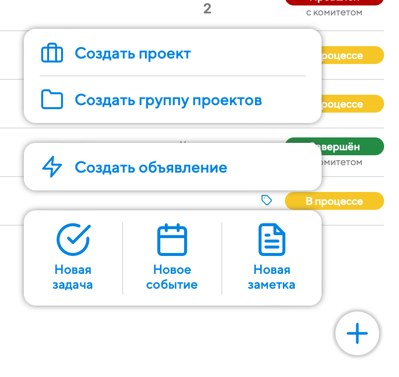 Например, главный бухгалтер может проверить финансовые итоги, коммерческий директор – подтвердить, что все работы по проекту выполнены, главный юрист – что все договоры закрыты и актированы. Отменить согласование через проектный комитет может только автор проекта.