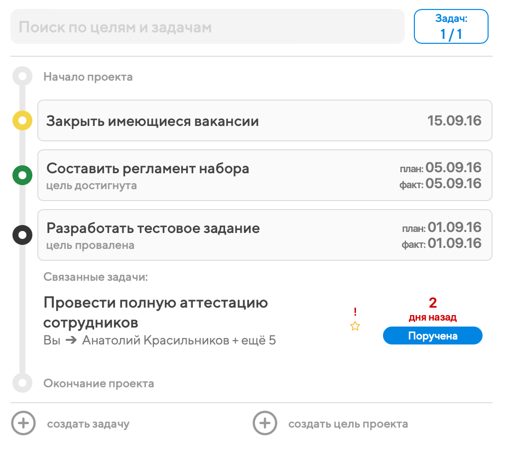 В средней колонке свойств проекта отображены цели и прикрепленные к ним задачи проекта.