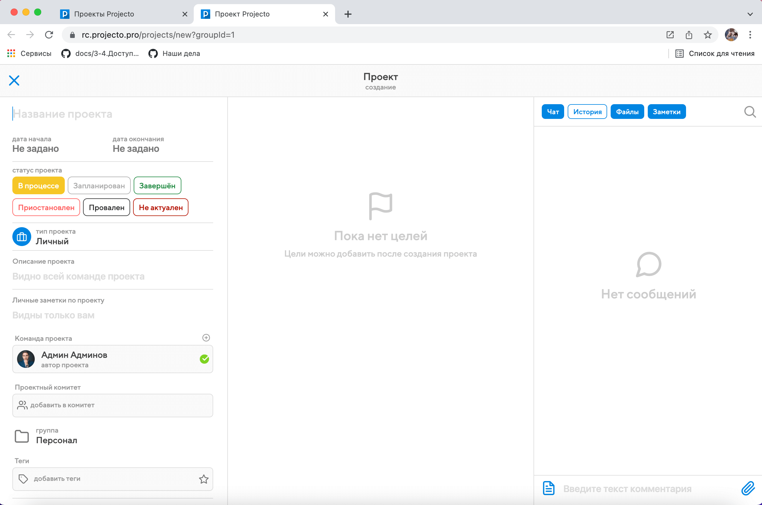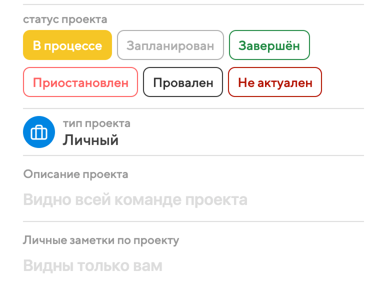 Тип проекта – важный атрибут, который регулирует видимость проекта и доступ к нему. Вы увидите это поле только если администраторы системы разрешили вам создание корпоративных проектов. Особенность таких проектов в том, что у них нет команды (только автор и руководитель), и они всегда доступны всем сотрудникам – и сами проекты, и всё их содержимое.