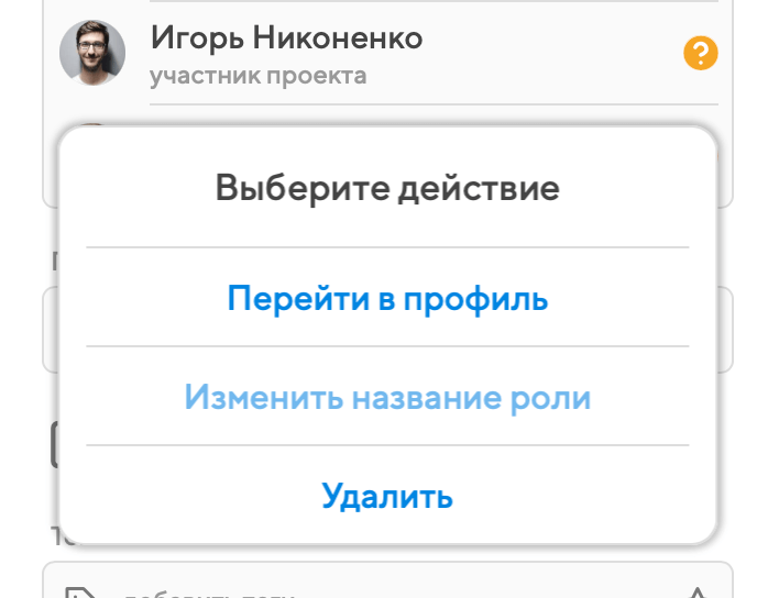 Остальных пользователей в проект можно добавить в качестве участников. Участники проекта всегда видят всё его содержимое, кроме приватных задач и событий. Чтобы обозначить, кто чем занимается в проекте, роли участников можно переименовать.