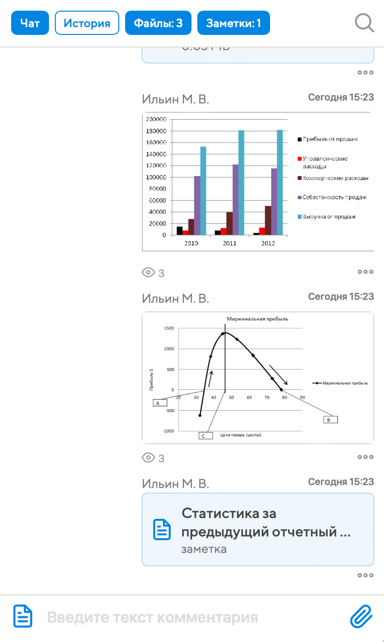 В правой колонке располагается лента активности, полностью аналогичная чатам задач и событий. Все прикреплённые к проекту файлы и заметки будут доступны именно здесь. Чтобы оставить на виду только файлы или заметки, воспользуйтесь кнопками фильтрации над чатом.