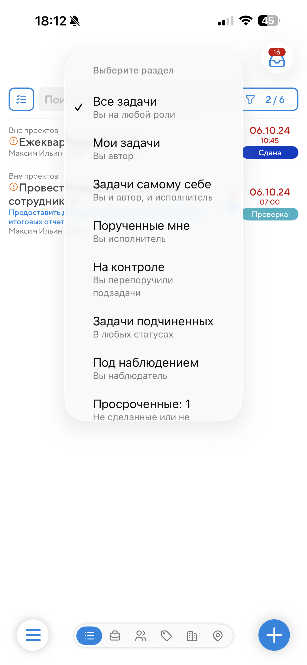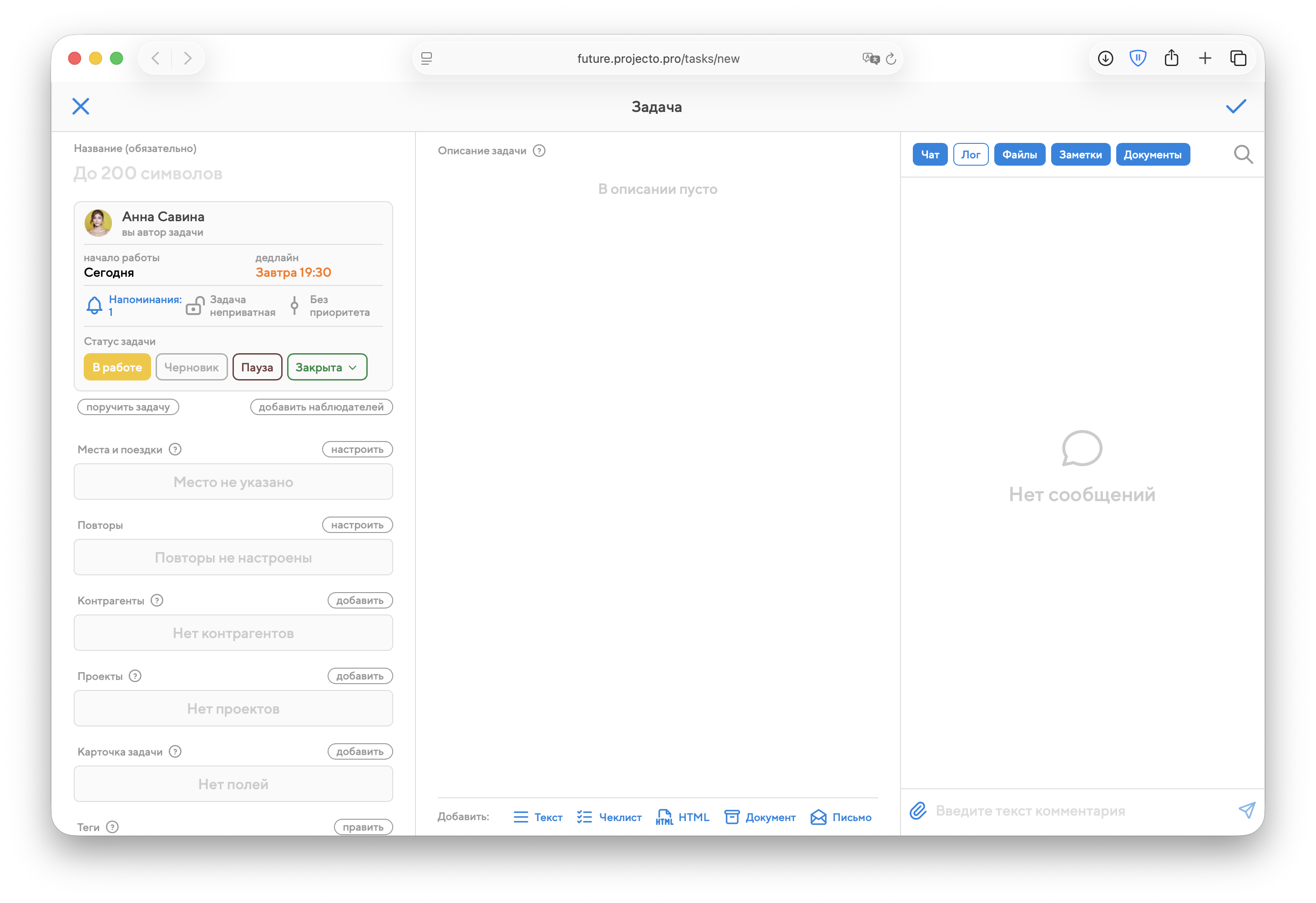 Задача может не относиться ни к одному из проектов. Если у вас не так много задач, вы можете не использовать проекты вовсе. Но если вас пригласили в какие-то общие рабочие проекты, старайтесь создавать новые задачи именно в них, чтобы они были видны остальным коллегам и не потерялись.