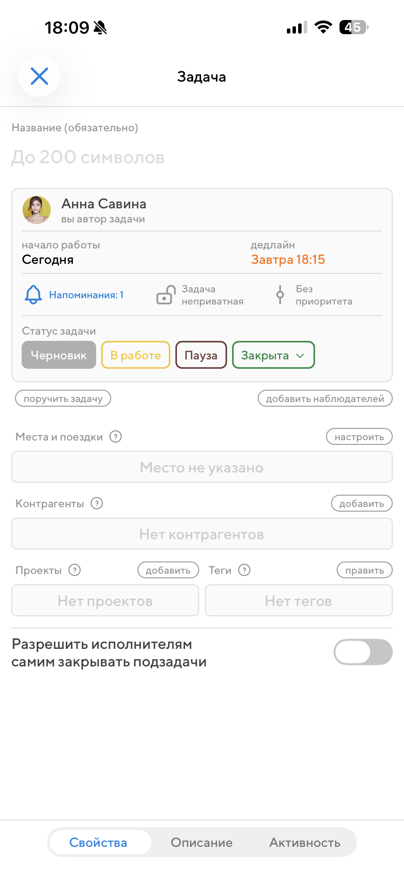Название задачи обязательно к заполнению и должно отражать её суть. Максимальная длина названия – 200 знаков. Старайтесь формулировать названия задач так, чтобы по ним было ясно, что именно нужно сделать: "Подготовить...", "Найти...", "Сформировать..." и пр.
