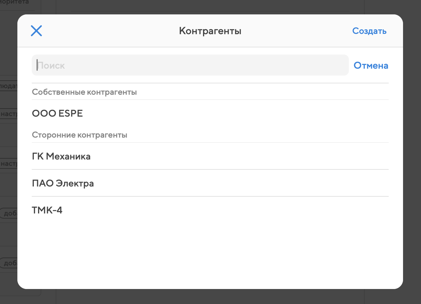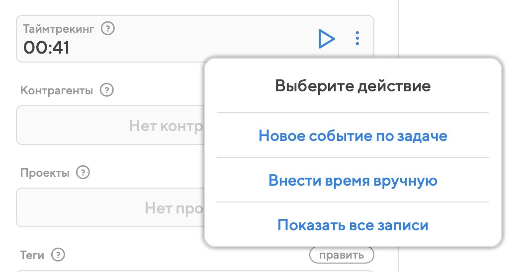 Задачу можно связать с любым количеством контрагентов (компаний или юрлиц, как собственных, так и сторонних). Для этого предназначен блок "Контрагенты".